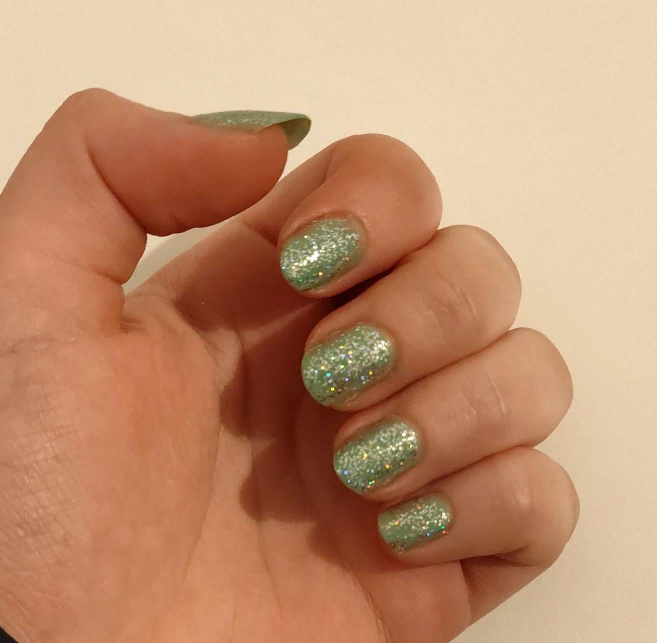 Skipped base today. This is one coat of $elf Made (OPI), two coats of a drugstore holo top coat, and one coat OPI top coat. It's a lot colder and somewhat greener IRL than in the picture.