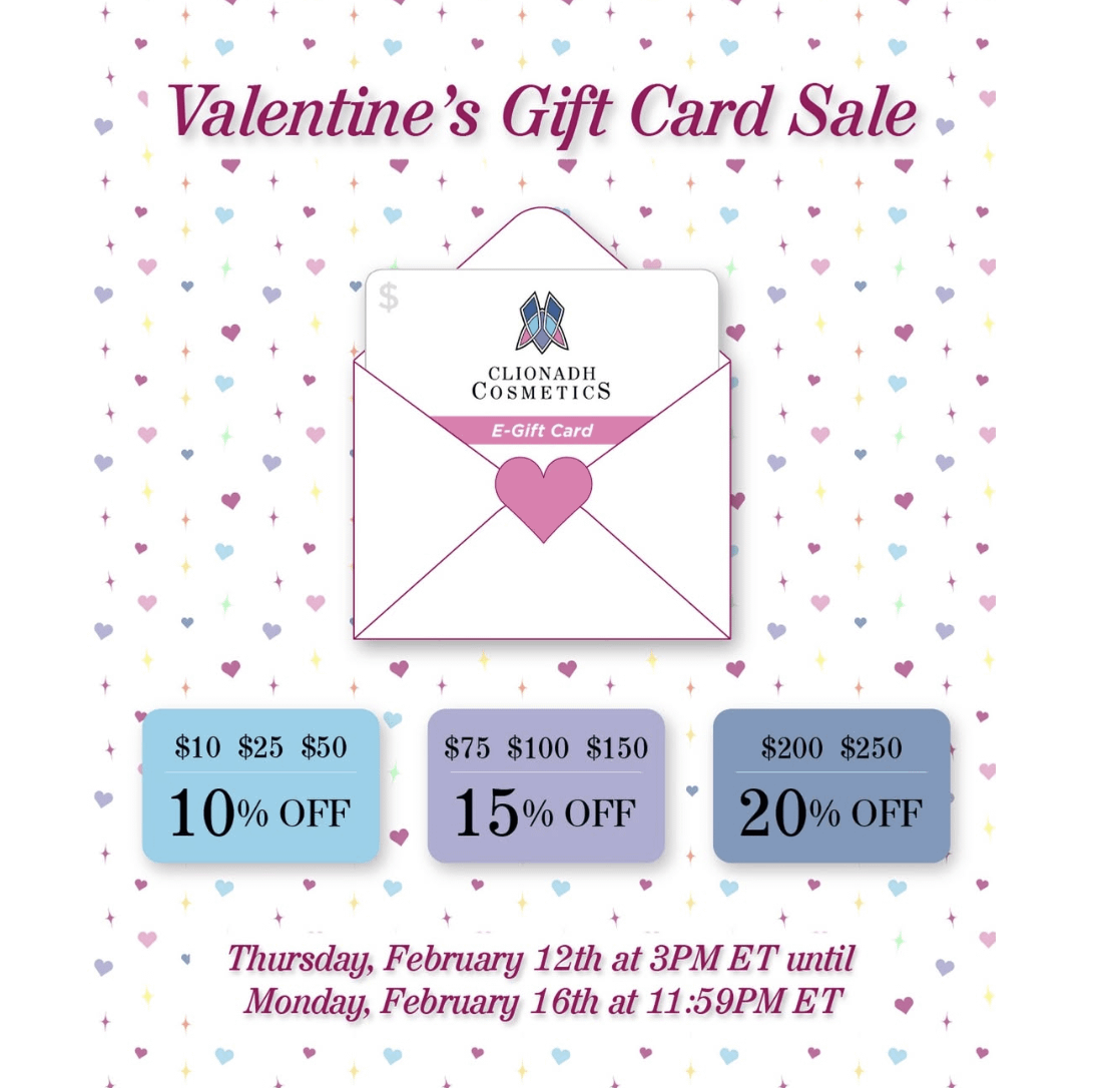 Clionadh Valentine’s eGift Card Sale: 10% off $10-$50 CAD, 15% off $75-$150 CAD, and 20% off $200-$250 CAD (ends 2/16)