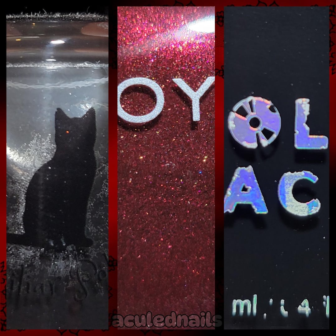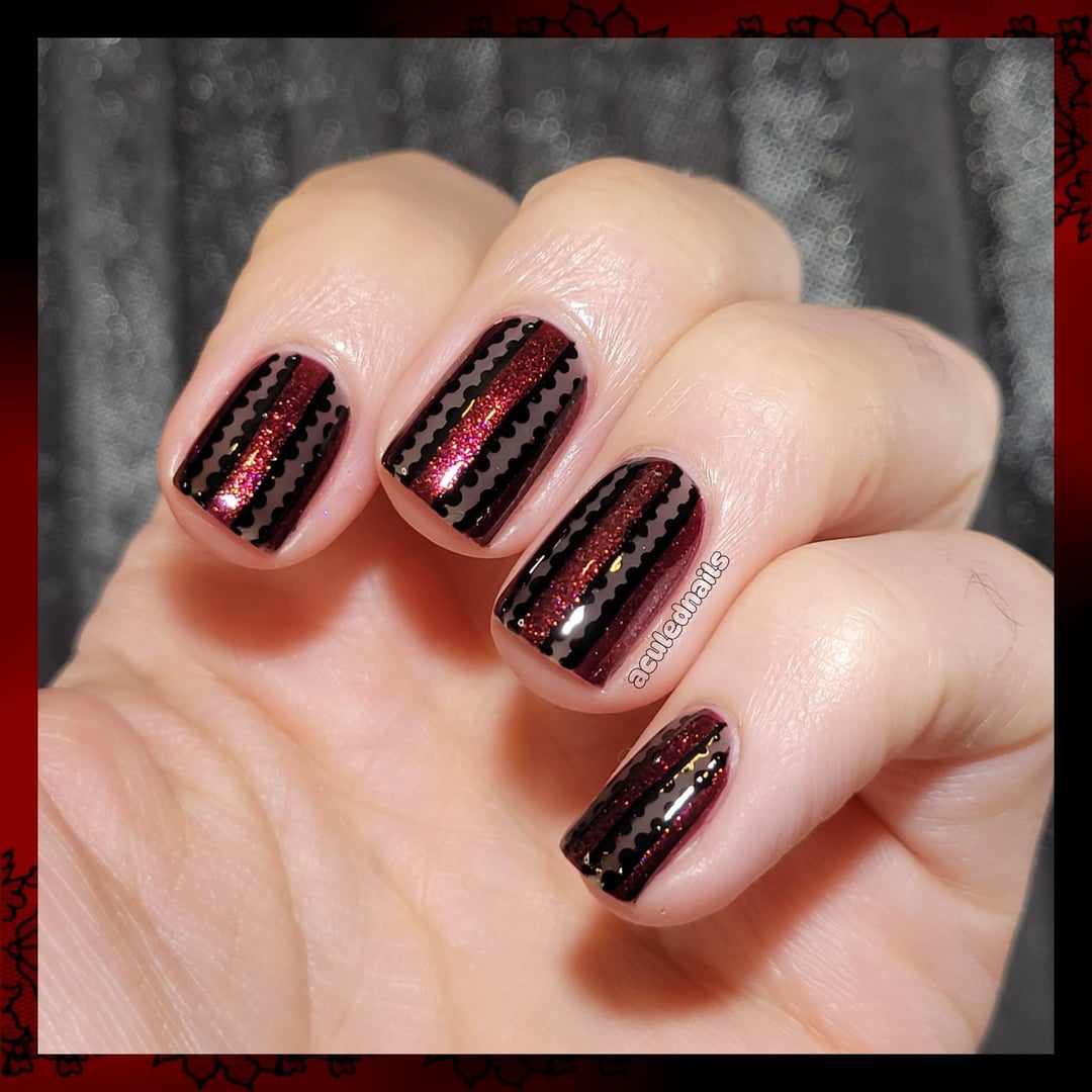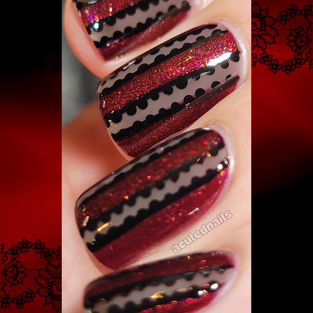 This mani was for the fun “Secret Cupid” collab where I was assigned a friend on insta and had to make a mani as a present for them. Super fun and inspiring! My giftee said she loved black and vampy Valentine’s shades so I knew I wanted to go down the dark route and this pseudo lacy, vampy dark Valentine’s design popped out! I wanted a dark jelly base to build it on and Familiar Smoke was the perfect sheer black jelly background for it. Then this sexy ass deep red with a gold shimmer looked like rich velvet mixed with the black dotting tool making it lacy!