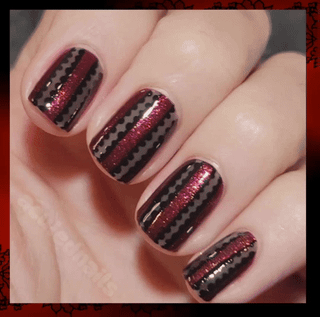 This mani was for the fun "Secret Cupid" collab where I was assigned a friend on insta and had to make a mani as a present for them. Super fun and inspiring! My giftee said she loved black and vampy Valentine's shades so I knew I wanted to go down the dark route and this pseudo lacy, vampy dark Valentine's design popped out! I wanted a dark jelly base to build it on and Familiar Smoke was the perfect sheer black jelly background for it. Then this sexy ass deep red with a gold shimmer looked like rich velvet mixed with the black dotting tool making it lacy!