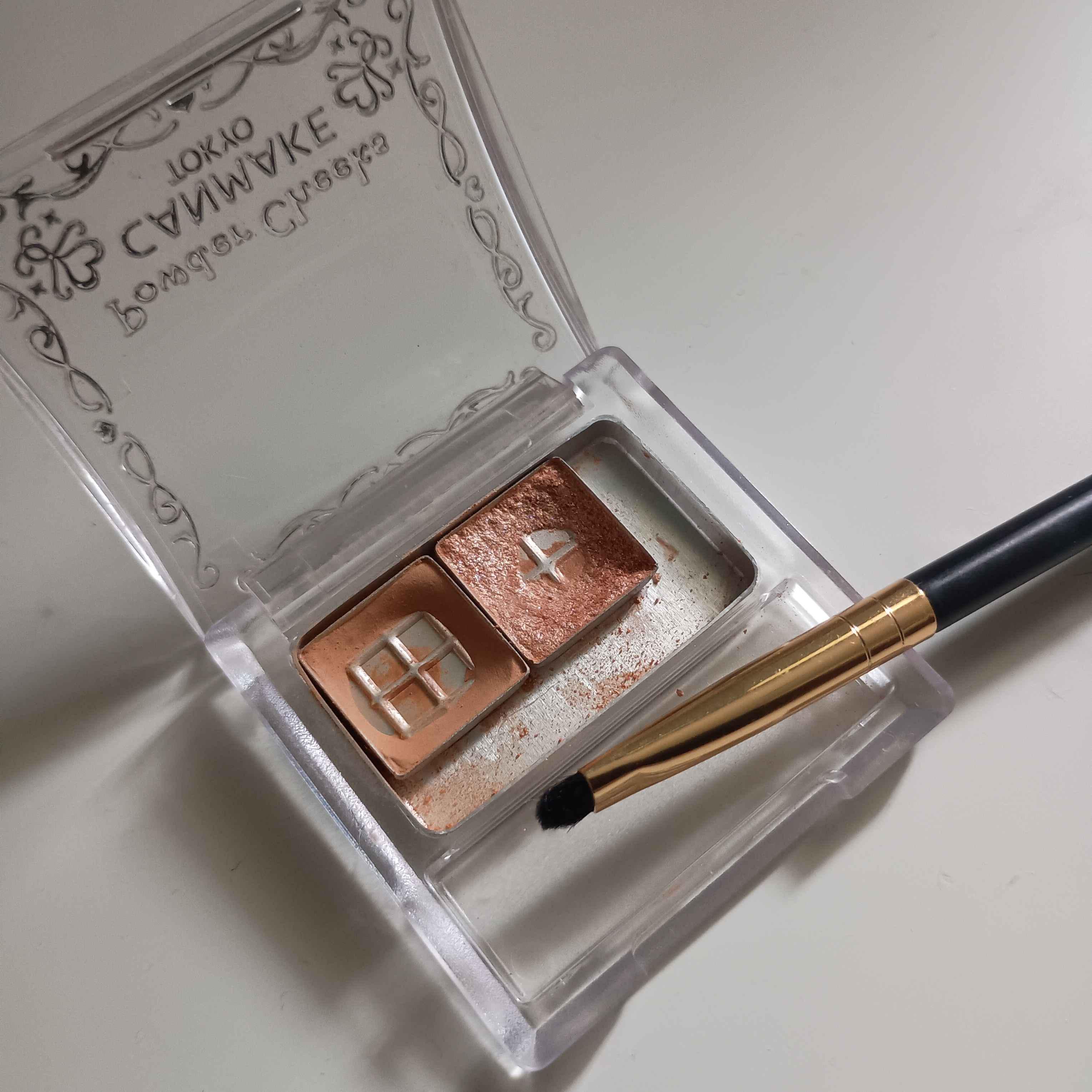 this is actually **&nd by rom&nd’s mellow eye palette in br02 apple cinnamon**, which is the japan-exclusive line of (mini/travel-sized) rom&nd products, but the original plastic case had its hinges break, and so i’ve had to move the pans themselves to an empty canmake powder cheeks container.