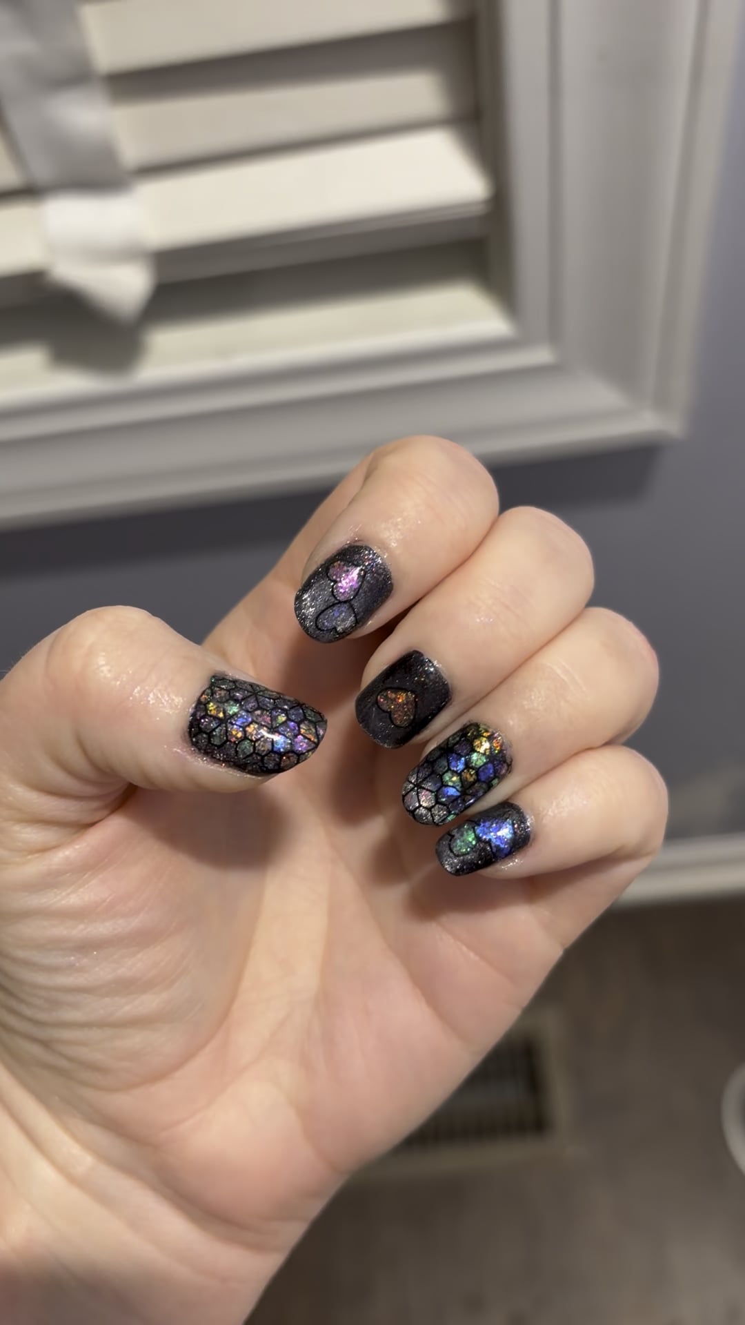 I started with my Nailtiques and base coat. Then painted two coats of ILNP’s “Overload”, magnetized in velvet style with their (ILNP’s) horseshoe magnet. Then I reverse stamped a pattern with black polish, which basically means I picked up the pattern with my stamper head and let it dry on there. Then I carefully globbed on all of the Holo Taco Unicorn Skins into each of the open parts of the design with a small cheapo nail art brush. Some sticky base coat and a top coat later, and voila! Same thing with the hearts on my index, middle, and pinky fingers.