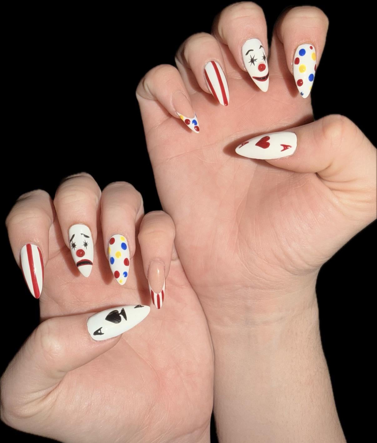 Was really feeling a circus clown theme over a Valentine’s theme for this set. I couldn’t think of anything else, really, and I couldn’t be happier with the results! My nail tech did an incredible job, she’s SO talented! That freehand art takes next level skill !!! Nothing better than a monthly acrylic fill & stiletto claw re-sharpening lol ♠️🤡♥️ I came up with the ideas and nail placement, my nail tech took care of the rest, what do you think of these?