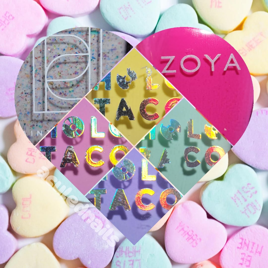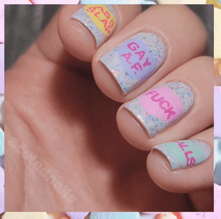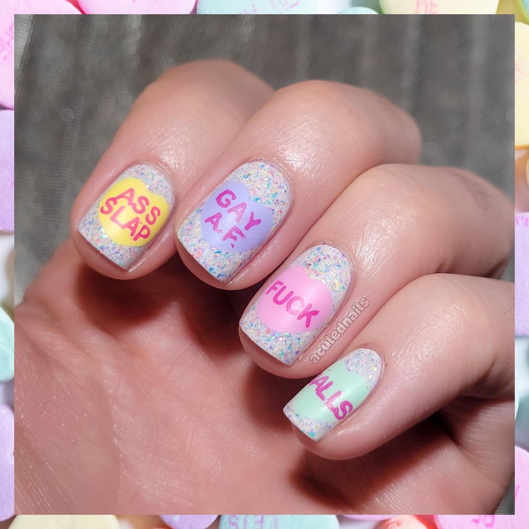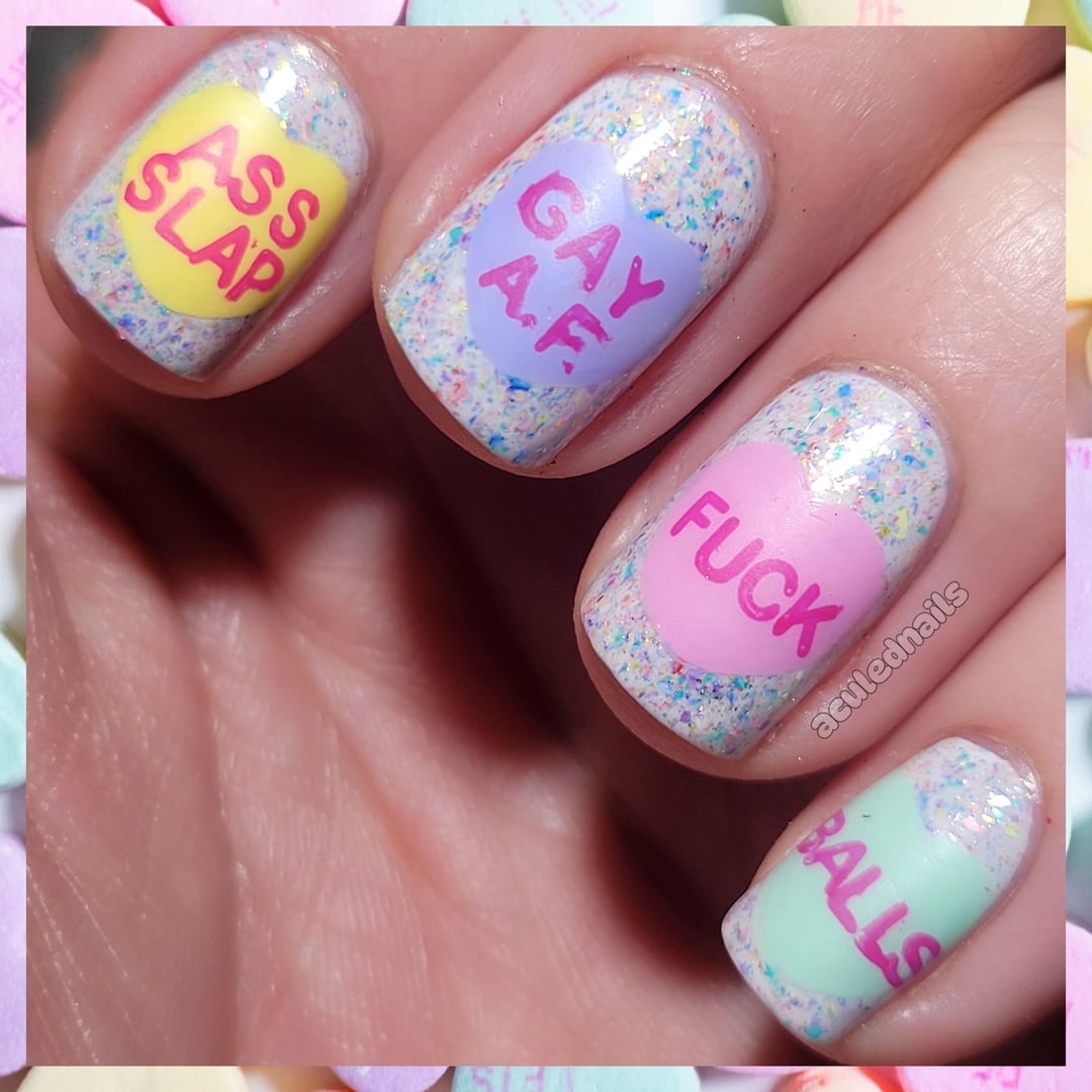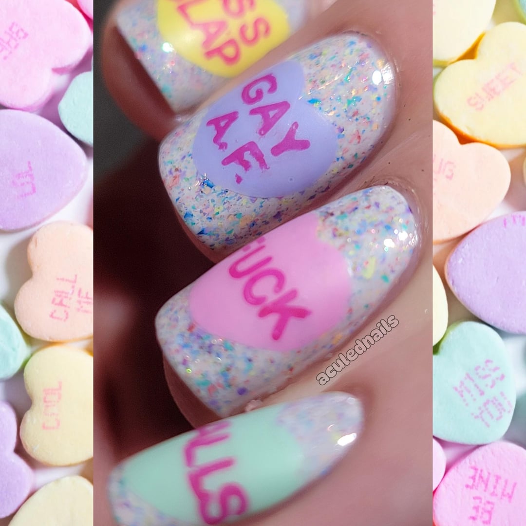 Happy Valentine's Day! Last year I enjoyed doing my own custom candy hearts, so this year I did them again…but even raunchier 😈 what's Valentine's day without a little spice? 😝💋 I had picked up this painted polish rainbow flakie crelly masterpiece that makes the perfect base (I actually bought 2 bottles knowing I would be OBSESSED with it) After that I painted some hearts and then using a fabulous candy heart stamping plate for the font, made some custom phrases. Who wouldnt enjoy reaching into the bag and pulling out a "BALLS" heart?? So romantic! 😝