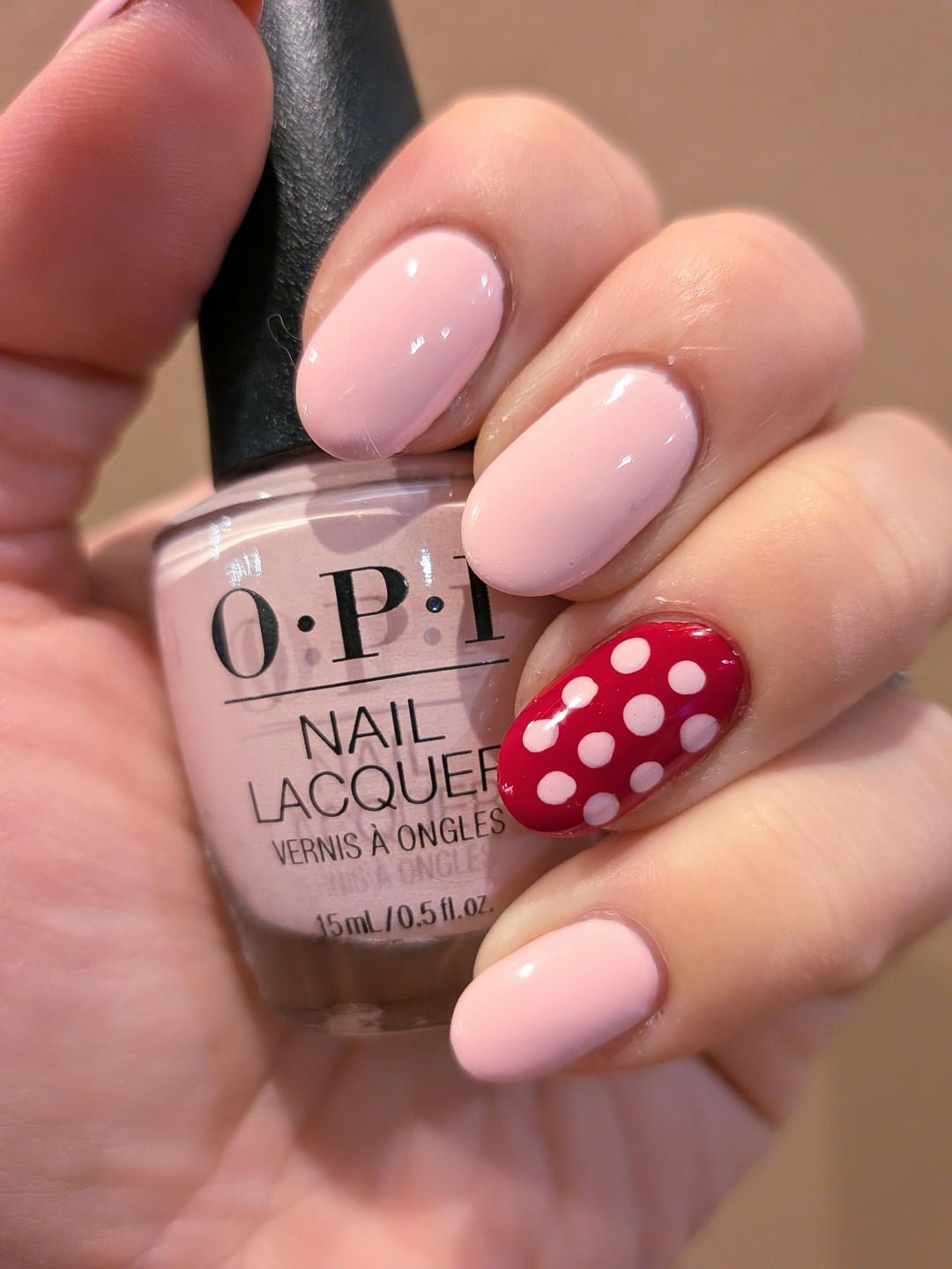 Color: OPI Suzi Shops and Island Hops on thumb, pointer, middle finger, and pinky (as well as the dots on the ring finger). OPI Color So Hot It Berns on the ring ringer