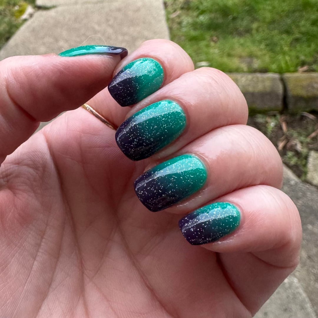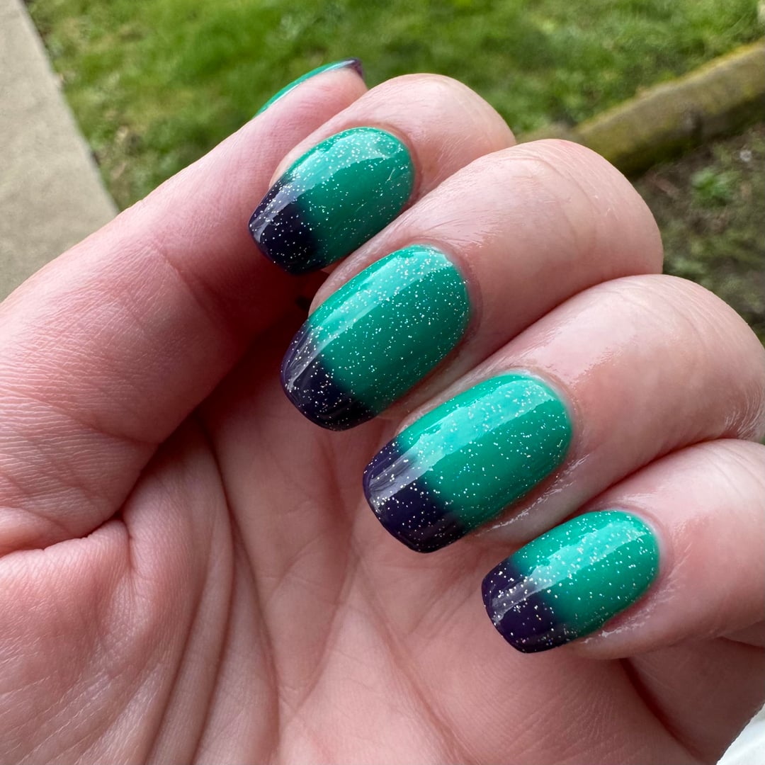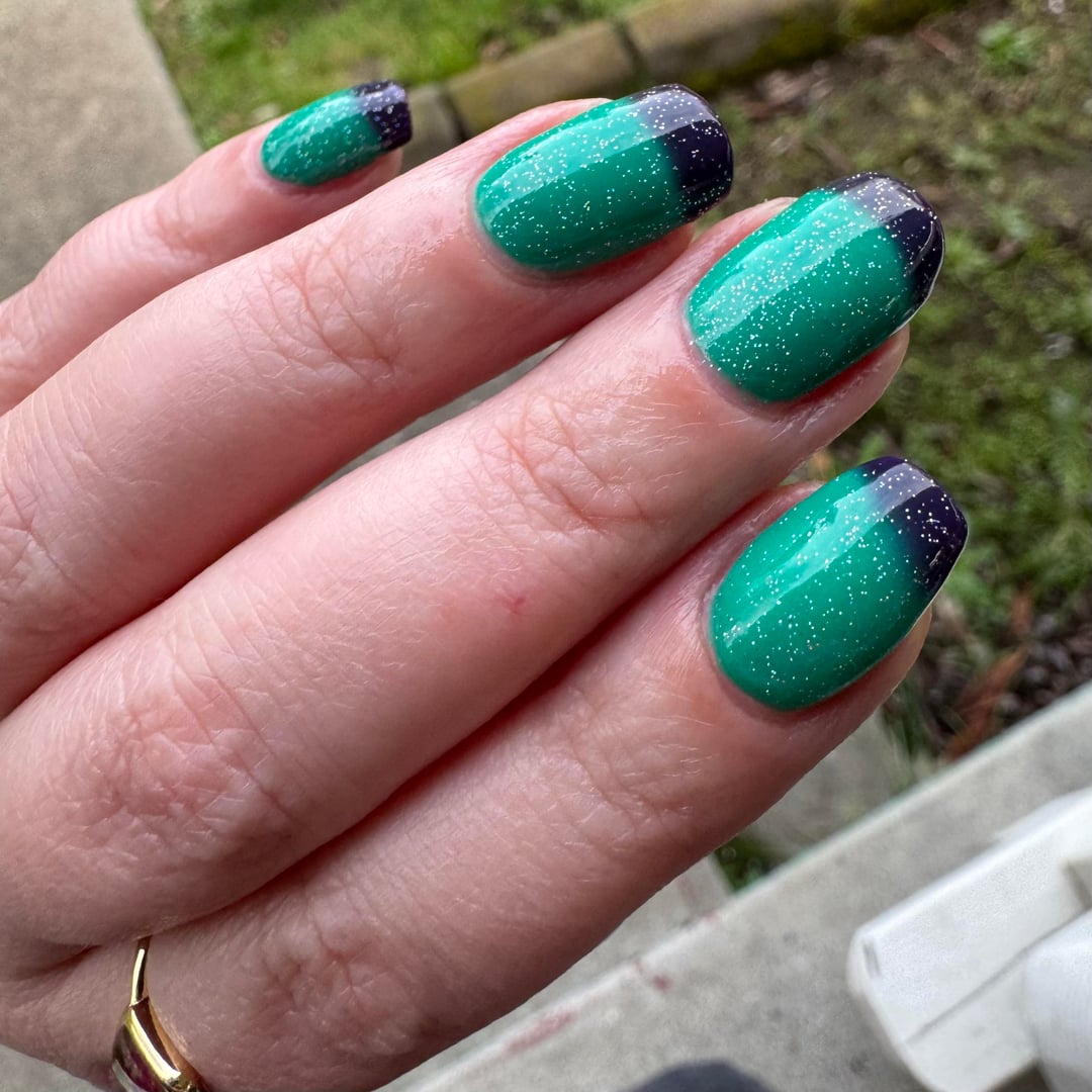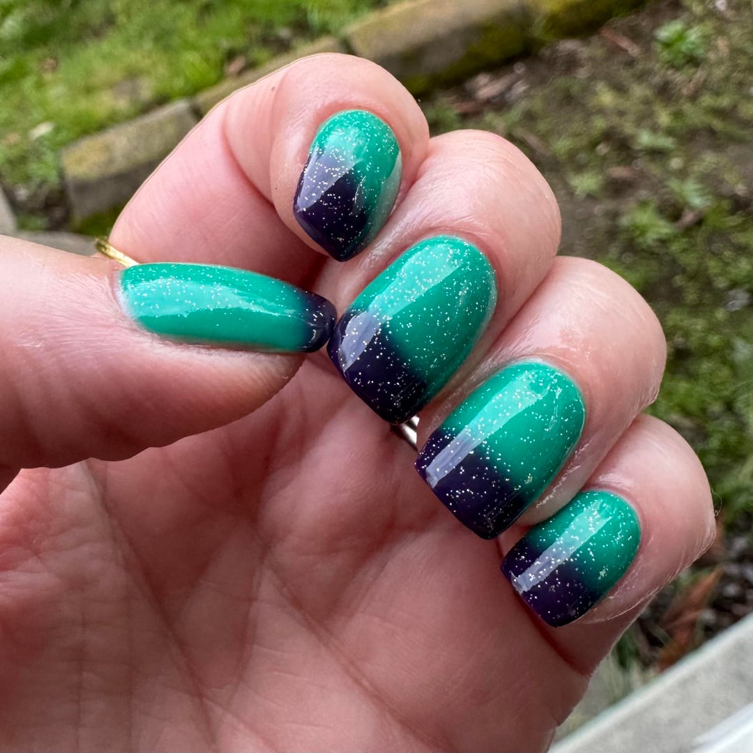 Got this lovely lady in the mail today and couldn’t resist putting her on immediately! Anyone that knows me knows i am obsessed with both teal and purple. Known for having either color hair for YEARS on end, and they are my two most purchased individual polish colors. Having them together in one thermal is the absolute ideal situation. And i couldn’t resist topping it off with a little sparkle ✨