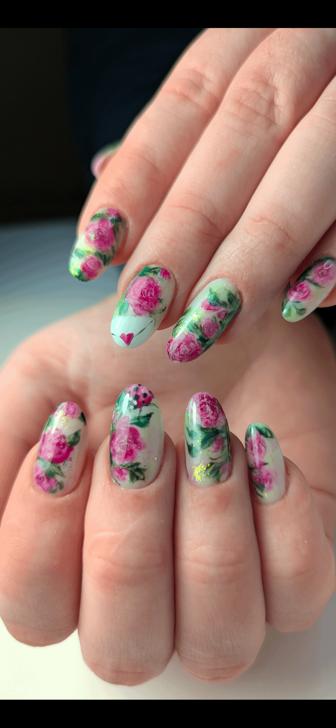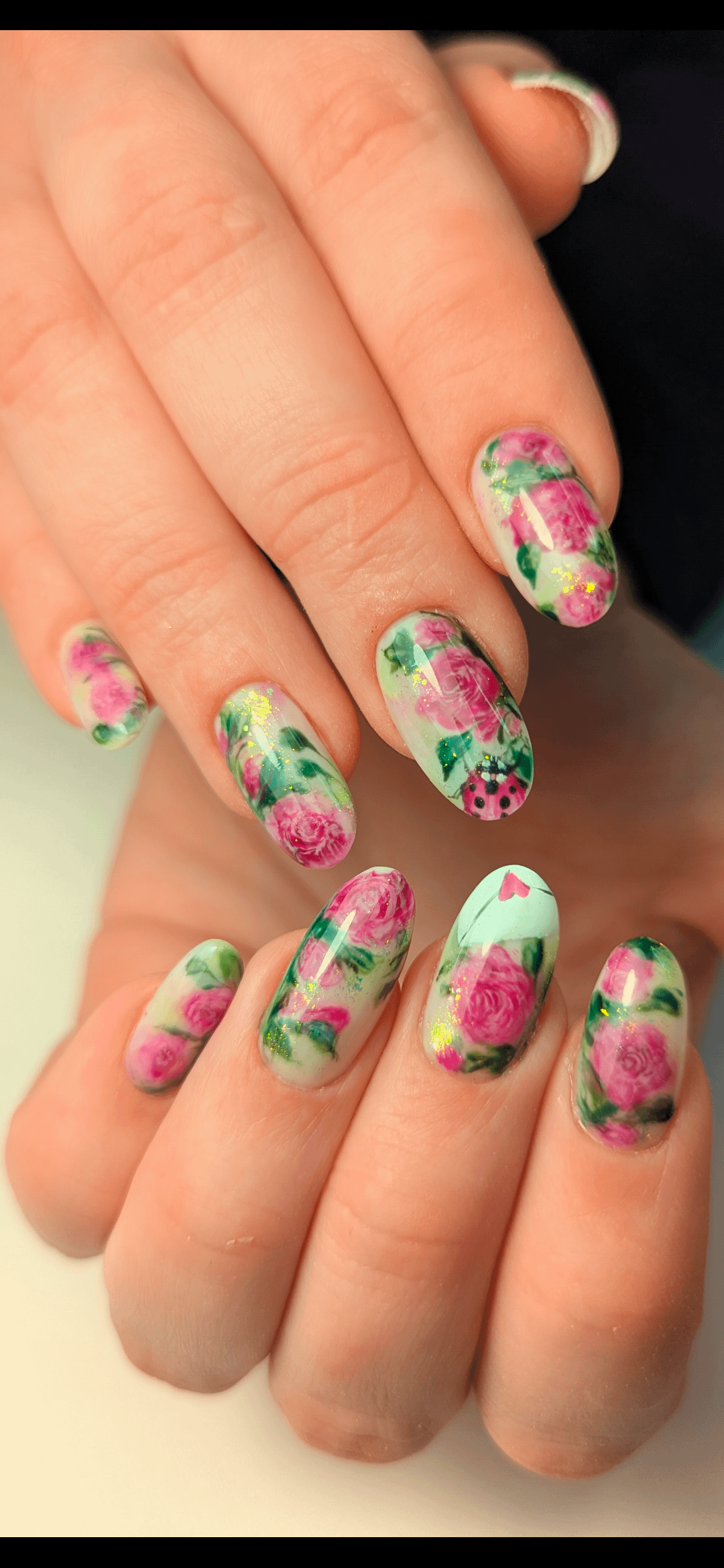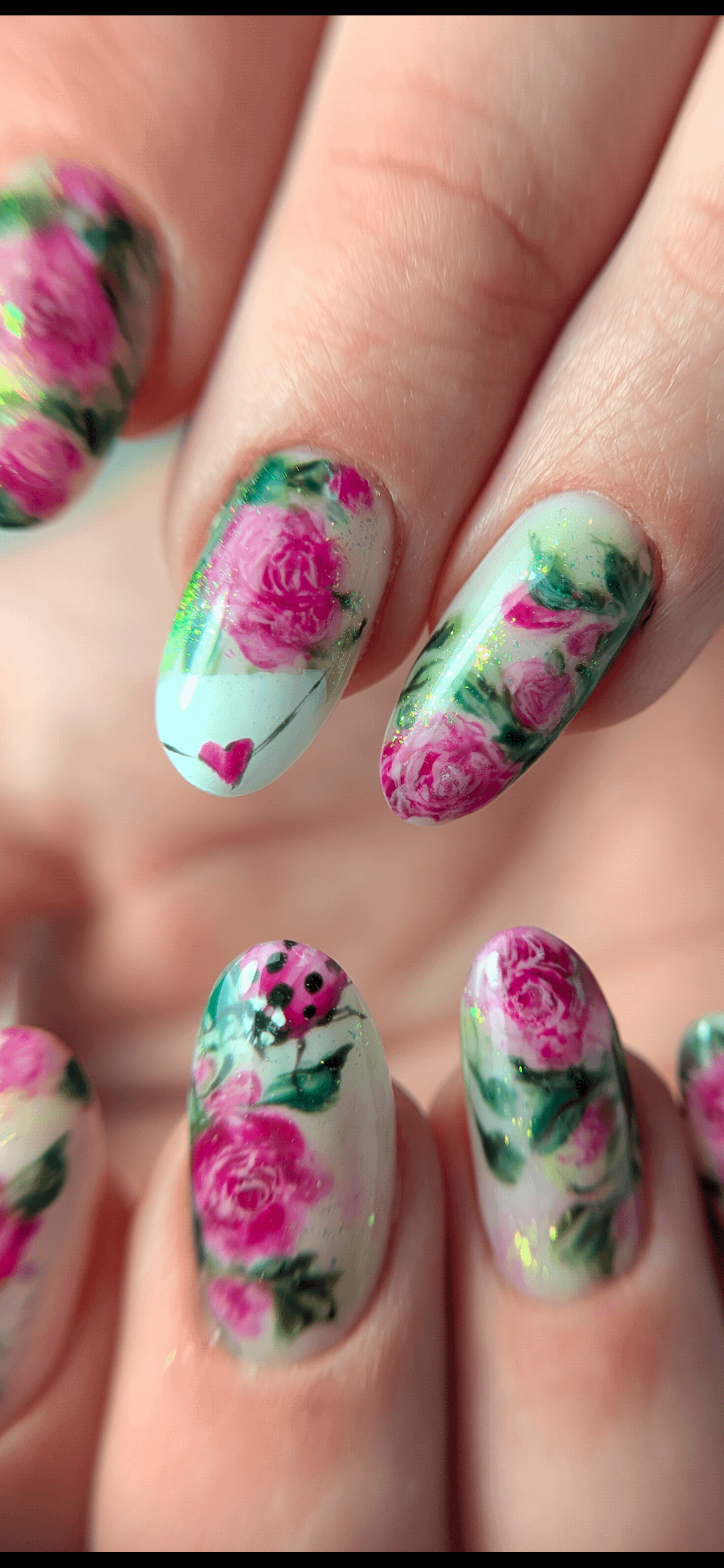 Inspiration florale romantique avec intégration des demandes de la cliente (coccinelle et enveloppe) 1h30 de nail art sur une construction en gel. by Downtown-Quality-448
