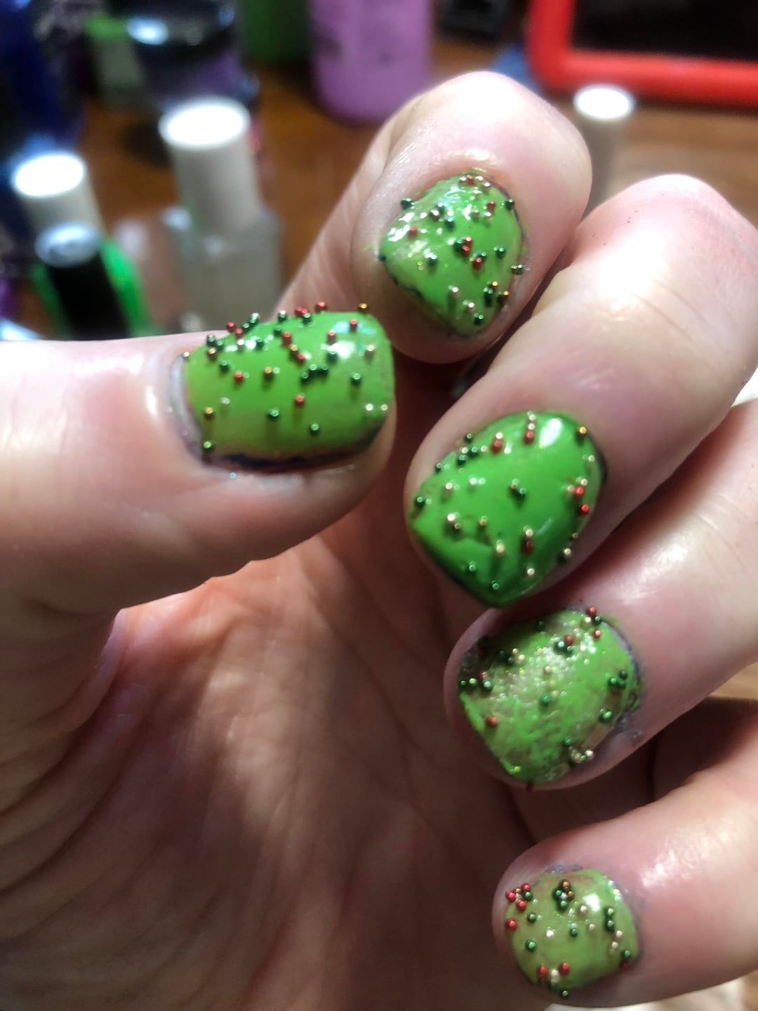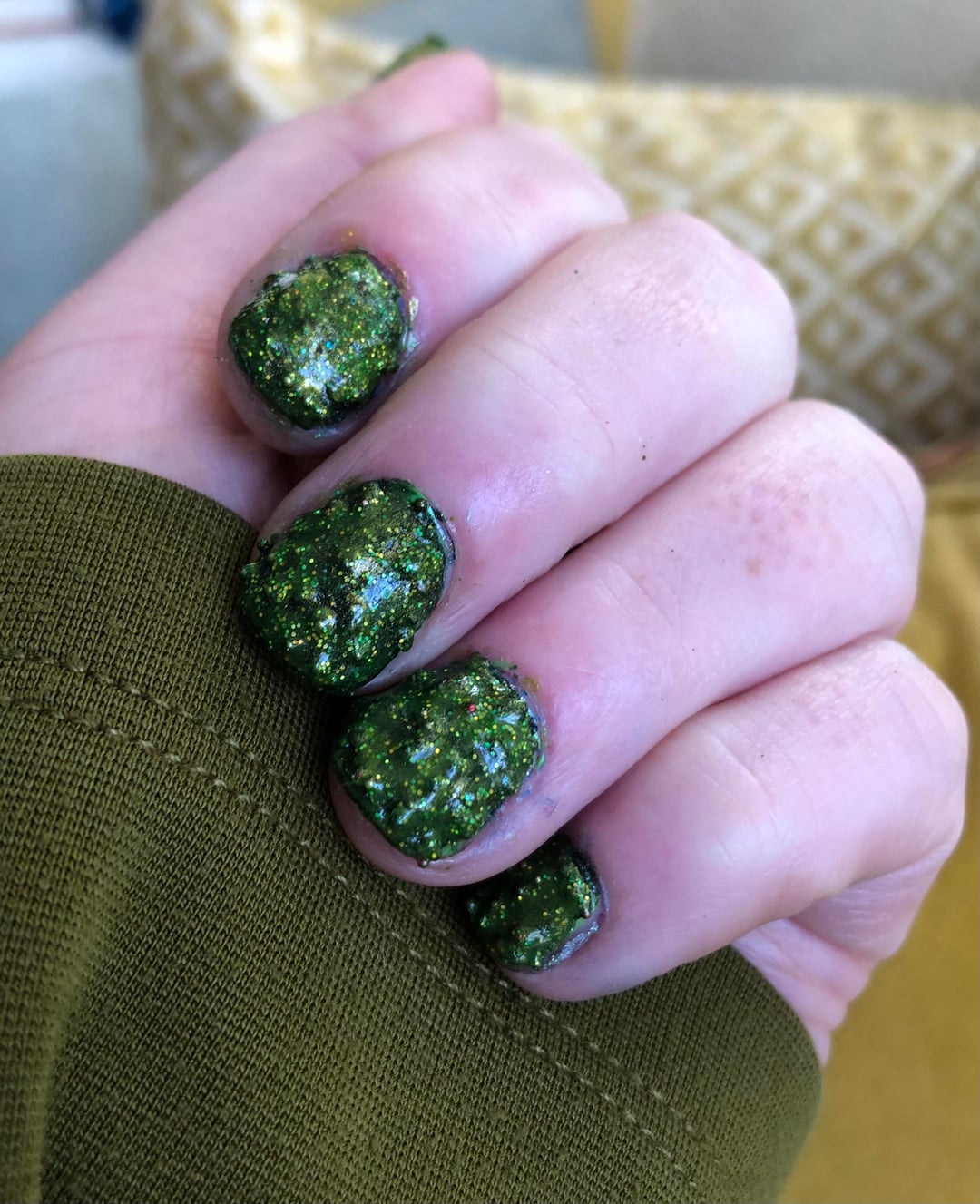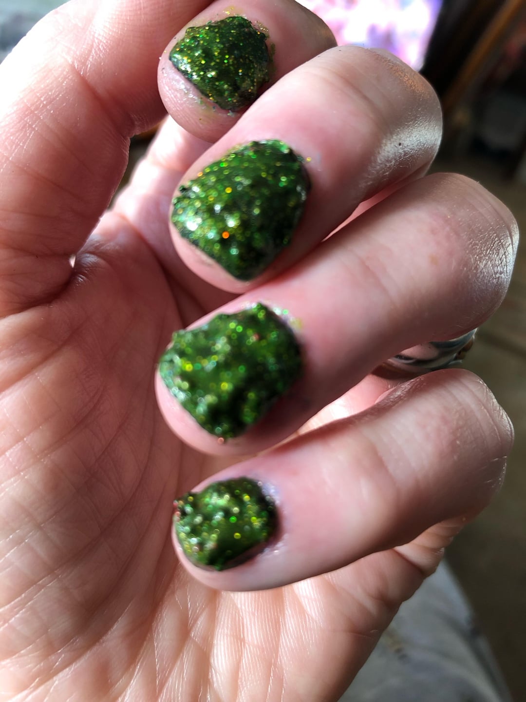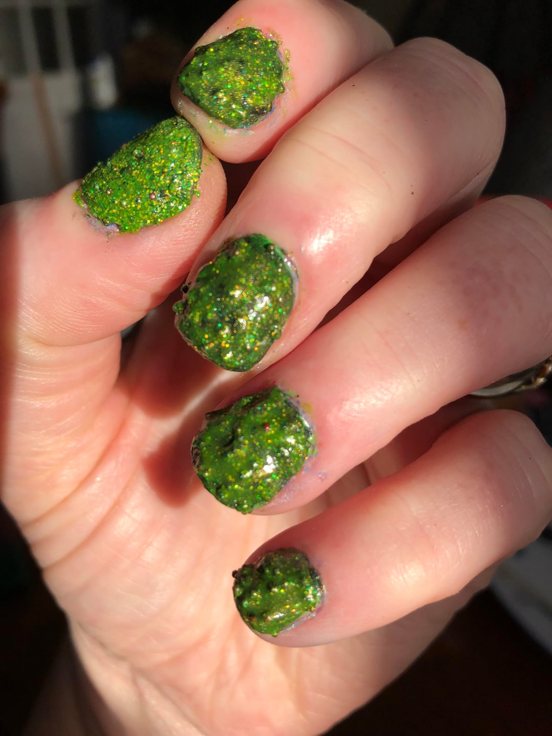 My partner, pickle connoisseur, says they're more accurate irl than in photos. Caviar beads for texture, sprinkled onto a lime green self-mixed polish, base coat would've been fine as none of that layer shows through. 2 coats of a darker green linear holo with some brighter green holo dabbed over the top. Seche Vite really is that bitch, a single layer managed to penetrate this textural nightmare gloppy mess and it seems fully set after 30 mins. Yay?