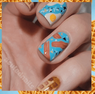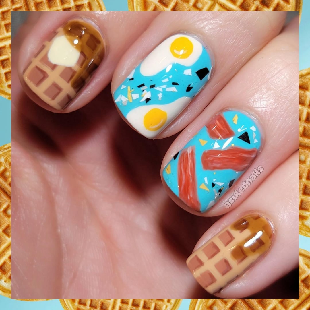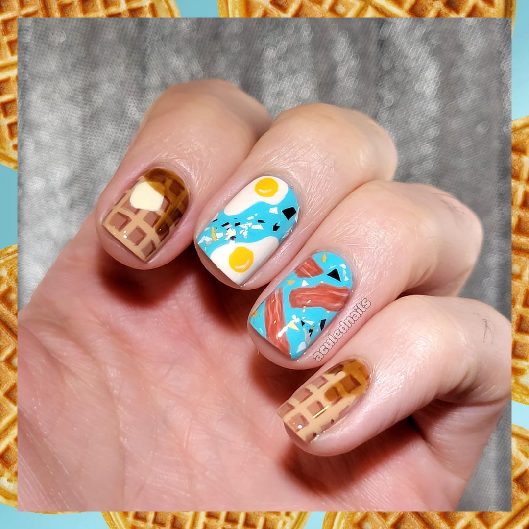 Breakfast foods are OP. They are the jam. How can you beat bacon, eggs, and waffles with REAL maple syrup? You put it on your nails. 🤪 I wanted to do waffles for Galentines Day…but by the time I thought to do it, I had missed the day, so then it turned into, let's just do a full brekkie. Eggs and aqua are an immediate pairing in my mind. That warm yellow needs to be countered by a bright blue, but after I did the eggs and bacon I wanted some topped in between and had this good shard one just to add something else in the open space. I was gonna leave the waffles dry, but who in their right mind does that. I had the PERFECT brown jelly from Familiar that made gorgeous syrup globs on my waffles! What's your favorite breakfast food??