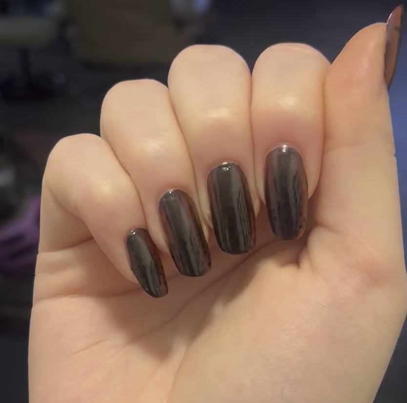 1 coat ILNP lockup, 1 coat ILNP ink, 1 coat ILNP eclipse, 1 coat nail aid biotin nail strengthener, flowers stamped off KADS plate using Essie licorice, 1 coat Sally Hansen insta dri