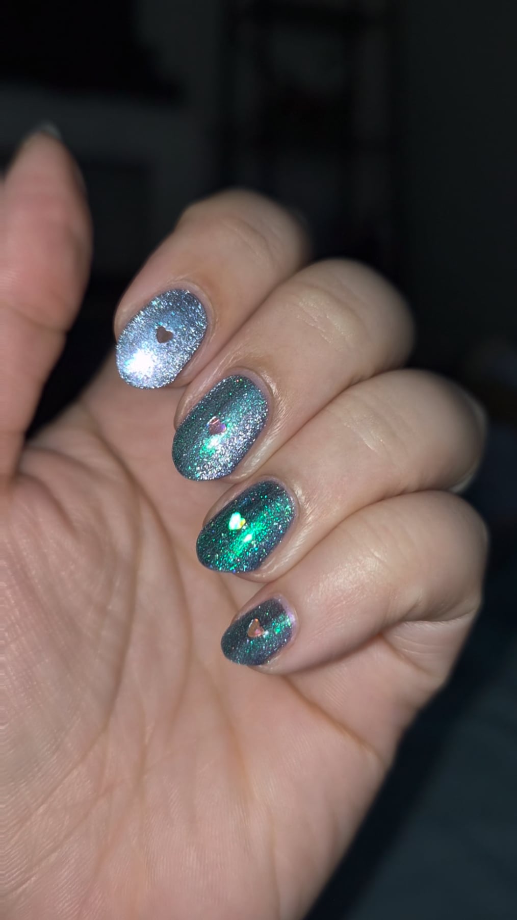 I've been living in icy blues & greens lately so pardon me while I post my matching mani. I used Holo Taco's Polar Opposites (velvet magnetized with horseshoe) and placed a single heart from Holo Taco's Sweetheart Taco on each nail. Sorry for using the phone flash, it's cloudy and raining here 😶‍🌫️