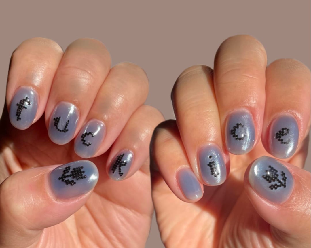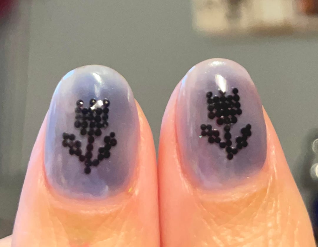 My nails on Valentine’s Day. I was inspired by this and wanted to try an alternative cross-stitch vibe with a message. It took a long time to plan and place each bead, and I like how it turned out for the most part. Realized too late that the thumb flowers are upside down🙃