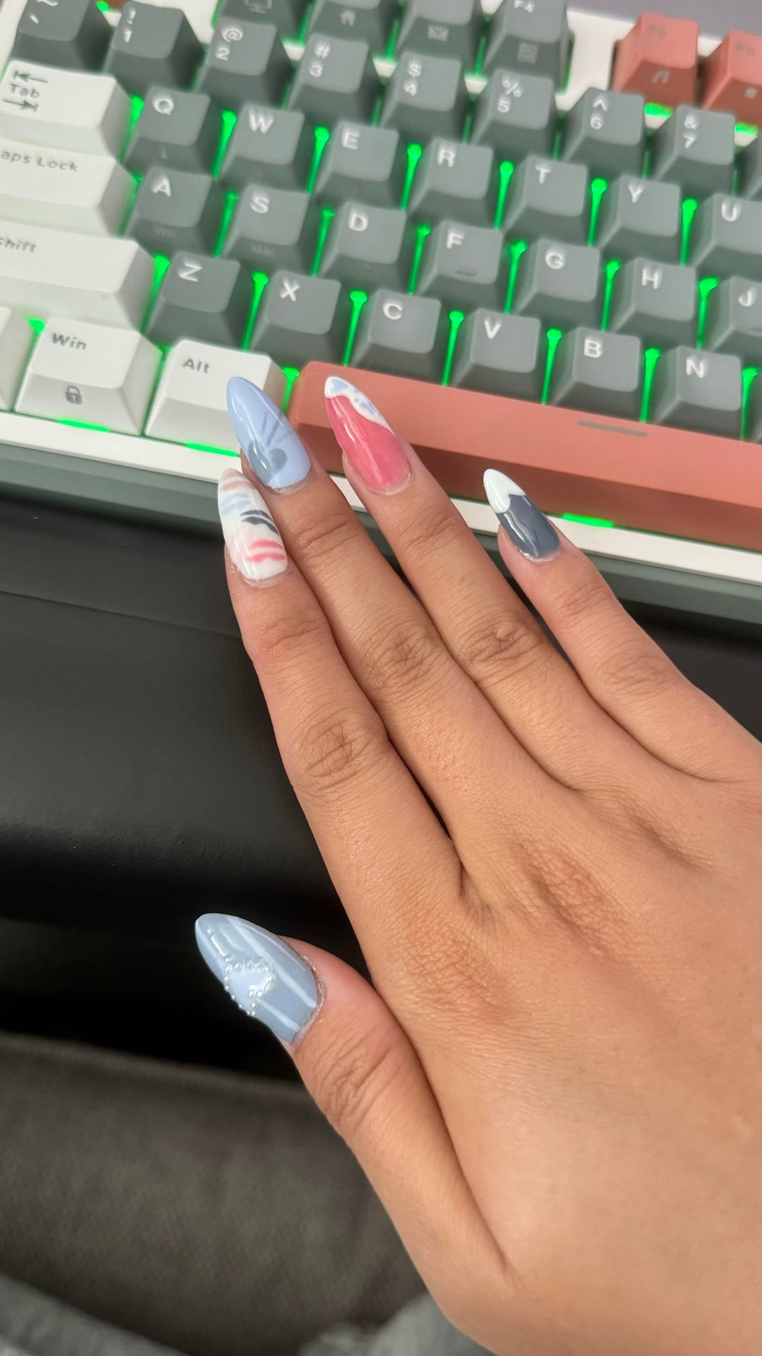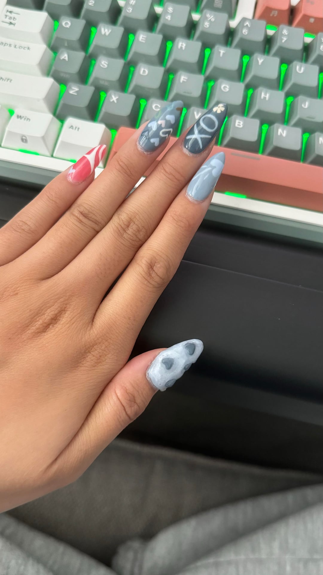First gel x set I’ve ever done!! I did them blue for a song called blue valentine. Since I’m new this took me sooo long bc I’m not use to painting much less with my non dominant hand. The sponge didn’t work out for the kissed so I had to figure out how to paint them😭😭