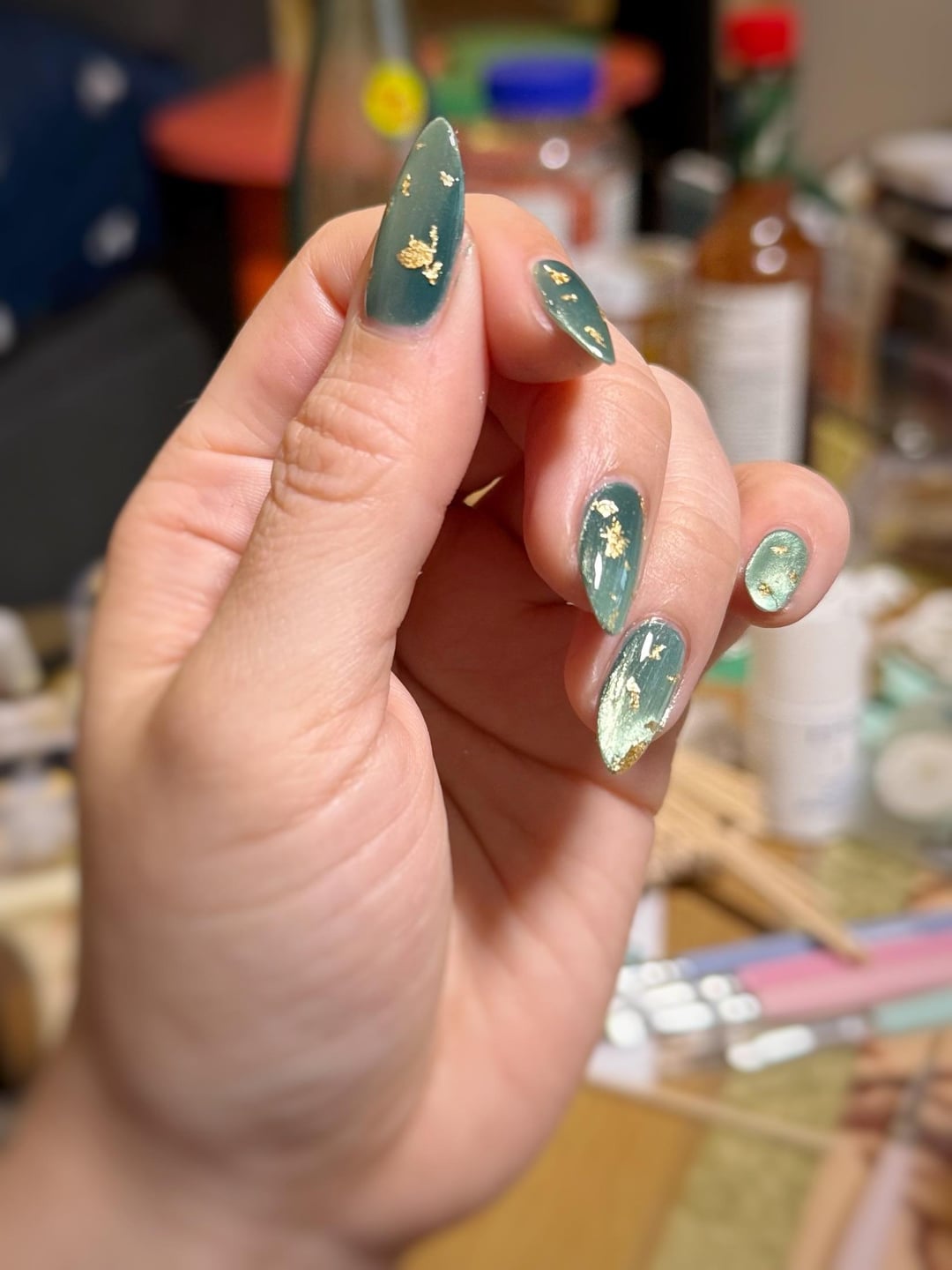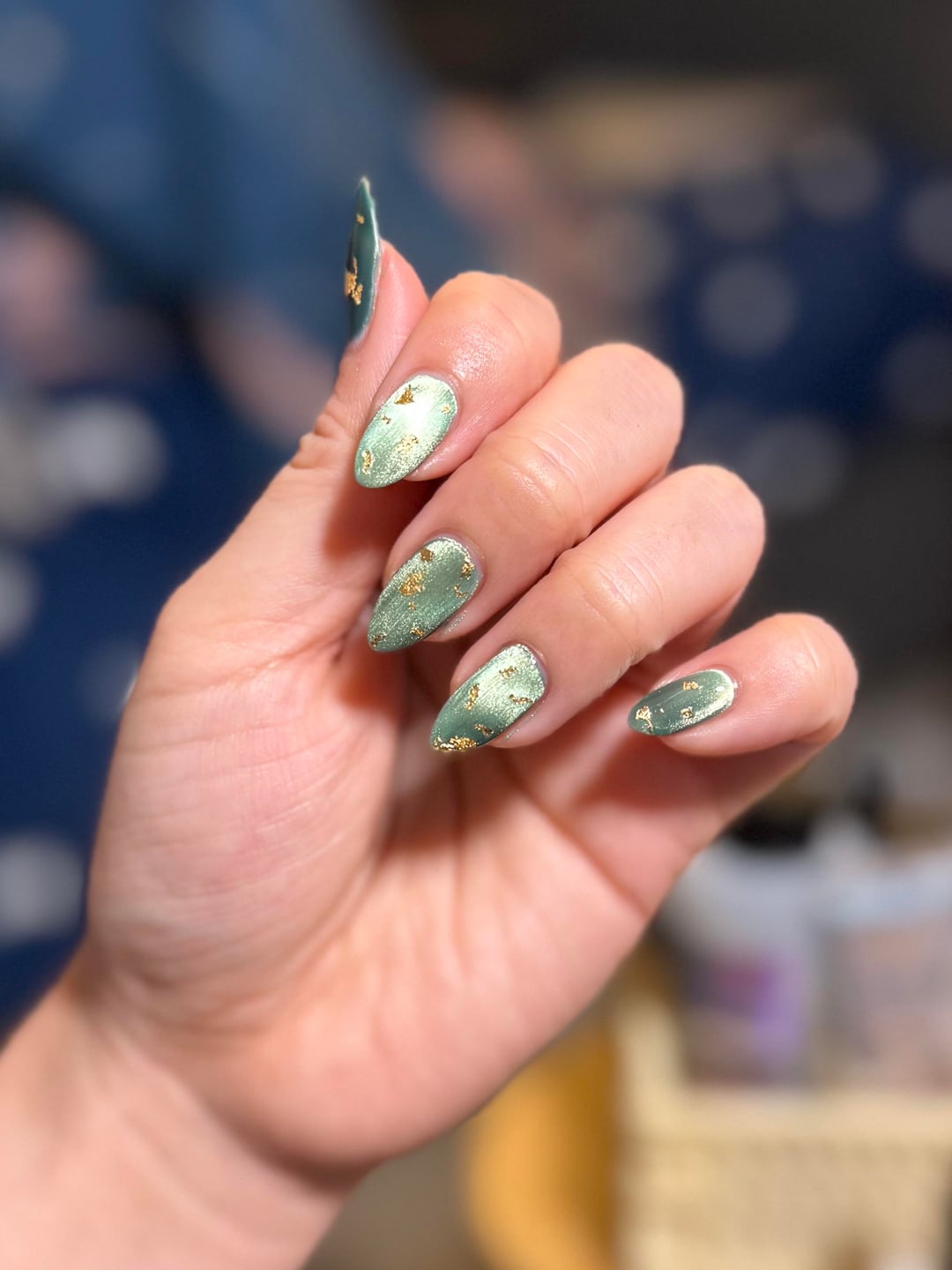 Also my first time working with gold foil/flakes so that was a learning process! Would definitely have benefitted from Magic Effect as I tried to do the velvet+bar magnet wavy thing but oh well I think it looks pretty 😍