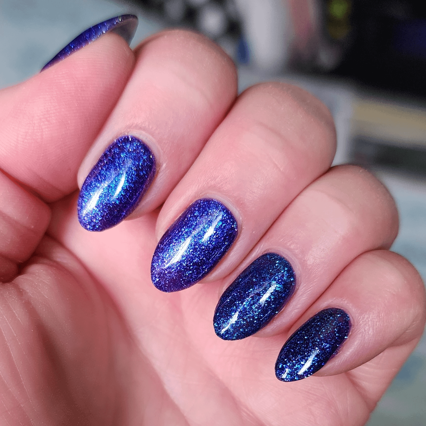 Got my nails refilled. Thumb, index & middle are a purple glitter. Ring & pinky are a darker blue. A tad hard to tell in the photo. I llllllove glitter, I tried get a better pic. Had square shape before, but I was in the mood for a change.