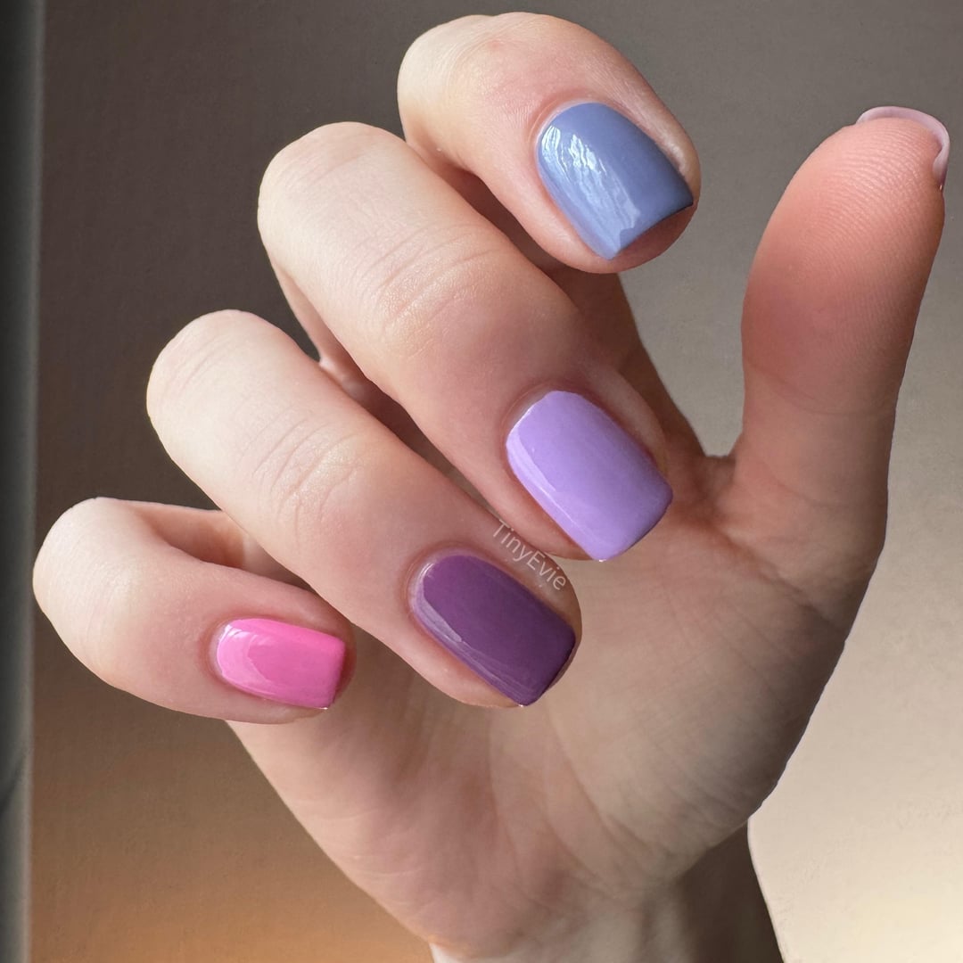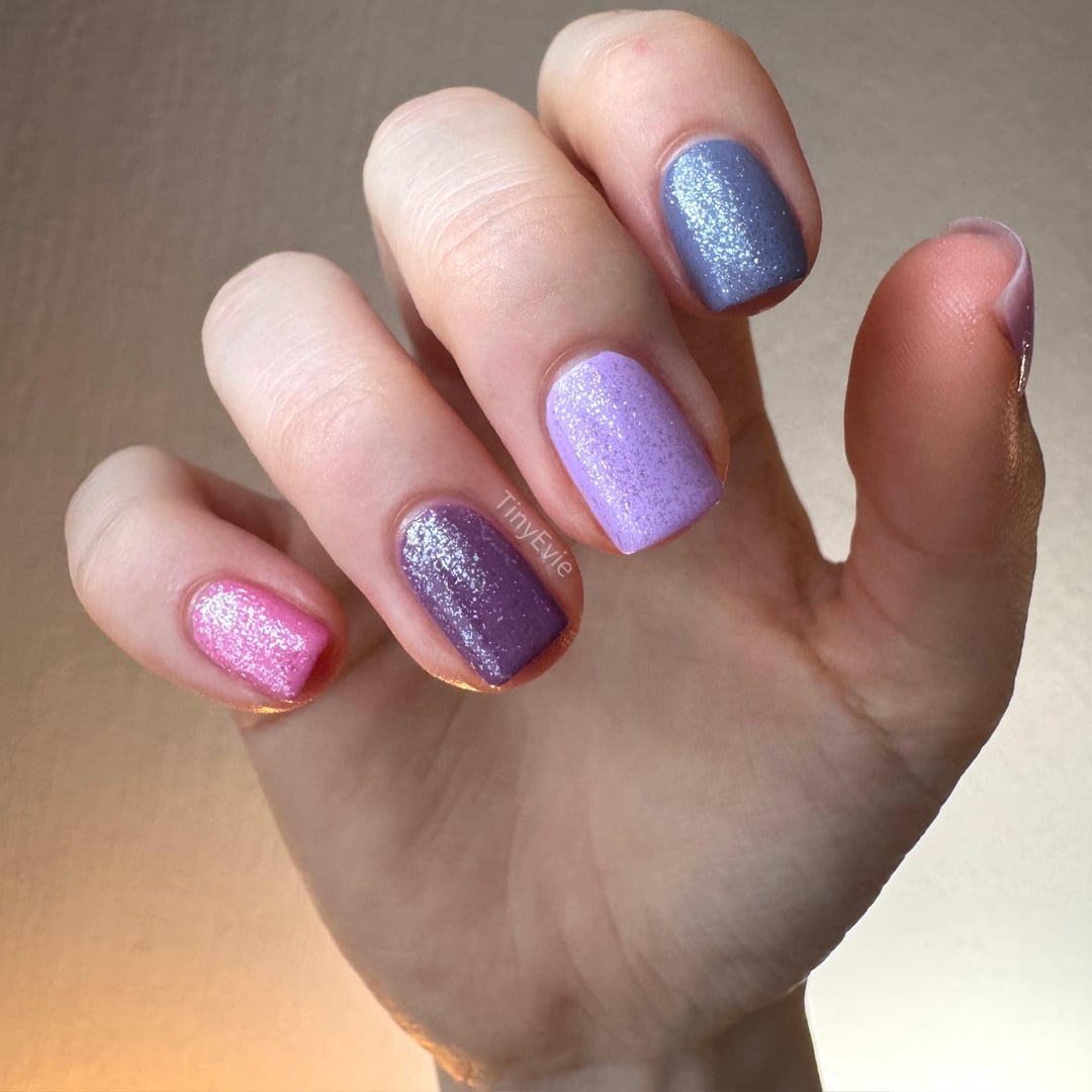 TinyEvie on February 18, 2026 6:00 pm https://preview.redd.it/wrijw7zhlakg1.jpeg?width=2923&format=pjpg&auto=webp&s=c33327b1e88f3185aa7bdfbece6473cee5fefac6 *Nail polishes used:* Base: 1x Miracle Base by Mesauda Thumb & middle: 1x Pinkish Lilac by Hema (nail laqcuer!) Index: 1x Lilac You A Lot by Hema (nail laqcuer!) Ring: 1x Mellow Mauve by Maybelline Pinky: 1x unknown Hema lacquer (Must be 10+ years old, sorry!🥺) Glitter topper: 1x Angel’s Breath by Cirque Colors