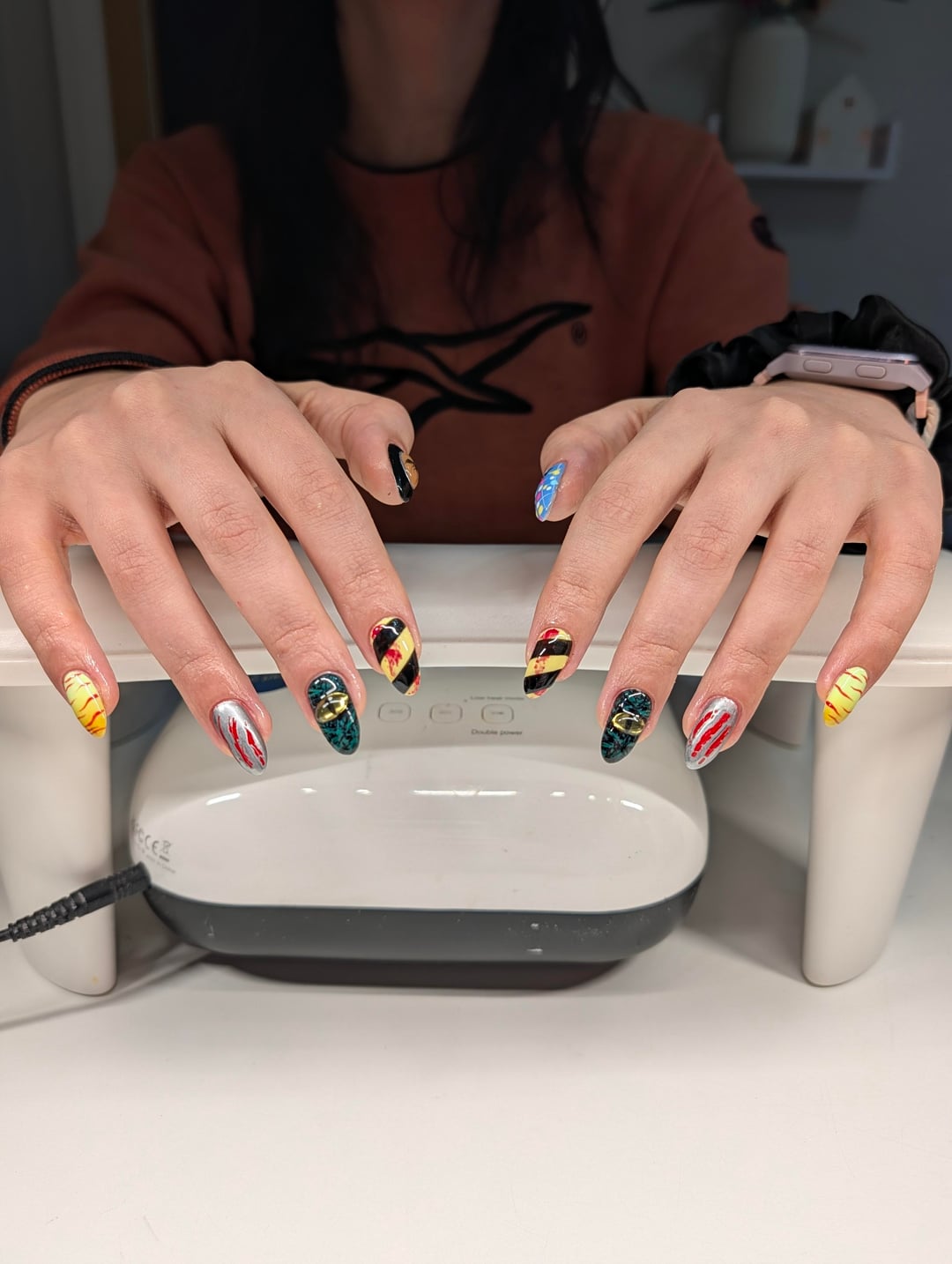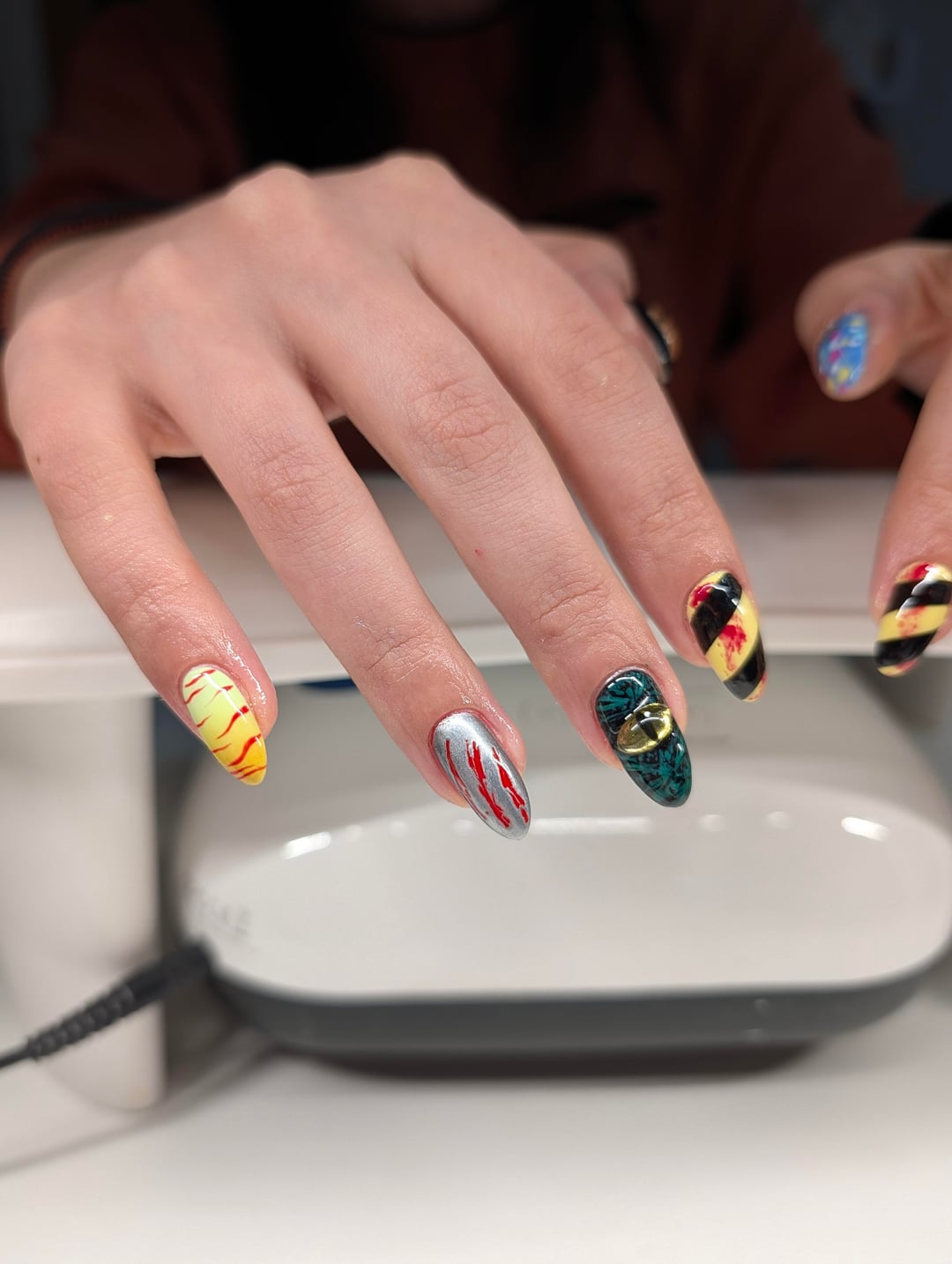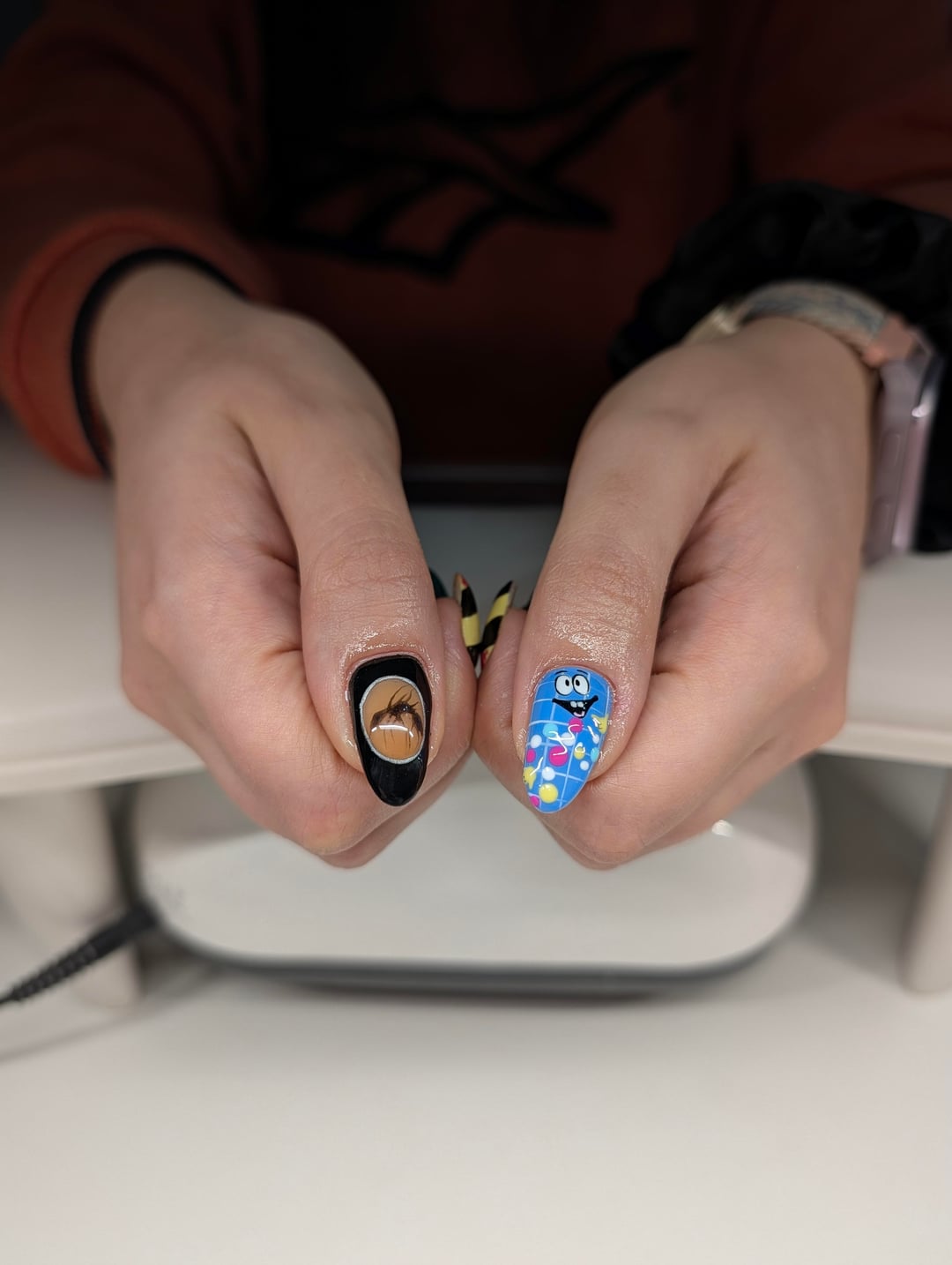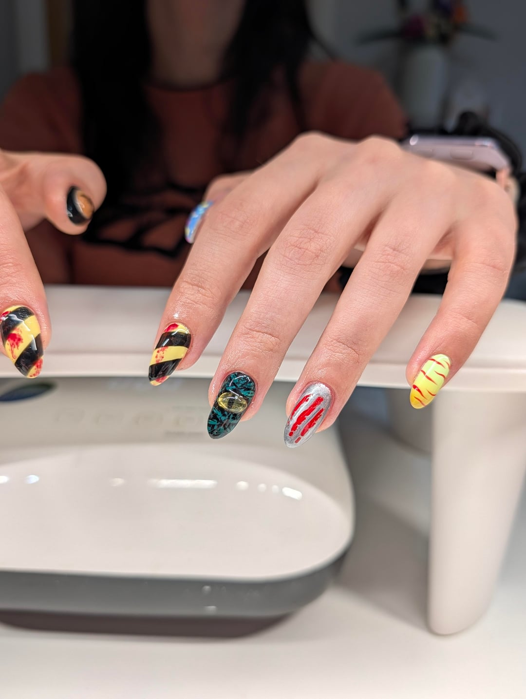 Recent Jurassic Park nails I got by my nail artist! The eyeballs are 3D and the mosquito inside the amber is also 3D! If you're a Jurassic park fan I hope you can see the talent of my nail artist especially with that Mr DNA! So good.