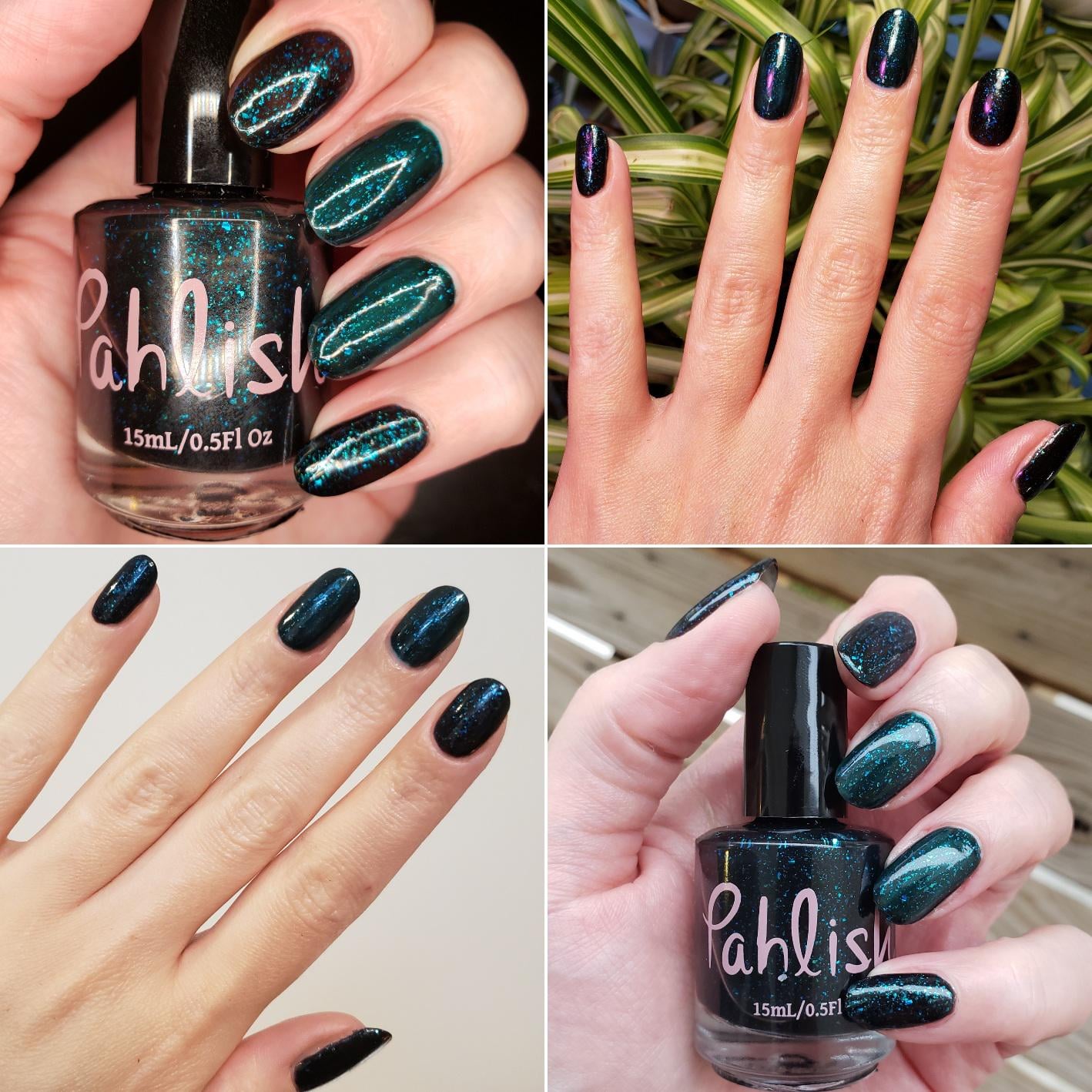 • Colors: Pahlish – Godzilla (3 coats on pinkie, index, and thumb); ILNP – Retro Teal (2 coats on middle and ring topped with 1 coat Godzilla)