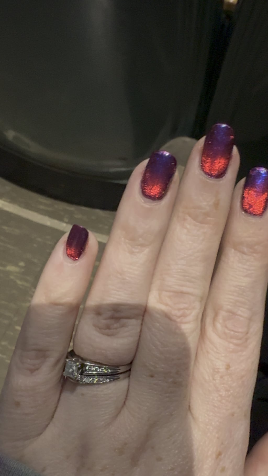 Emily de Molly Sunset Over the Bay (formerly Sundown). Easily my favorite magnetic I own! In person it’s got blue and purple from the base, and pink and orange in the magnetic pigment. It is absolutely STUNNING and totally looks like a sunset in a bottle.