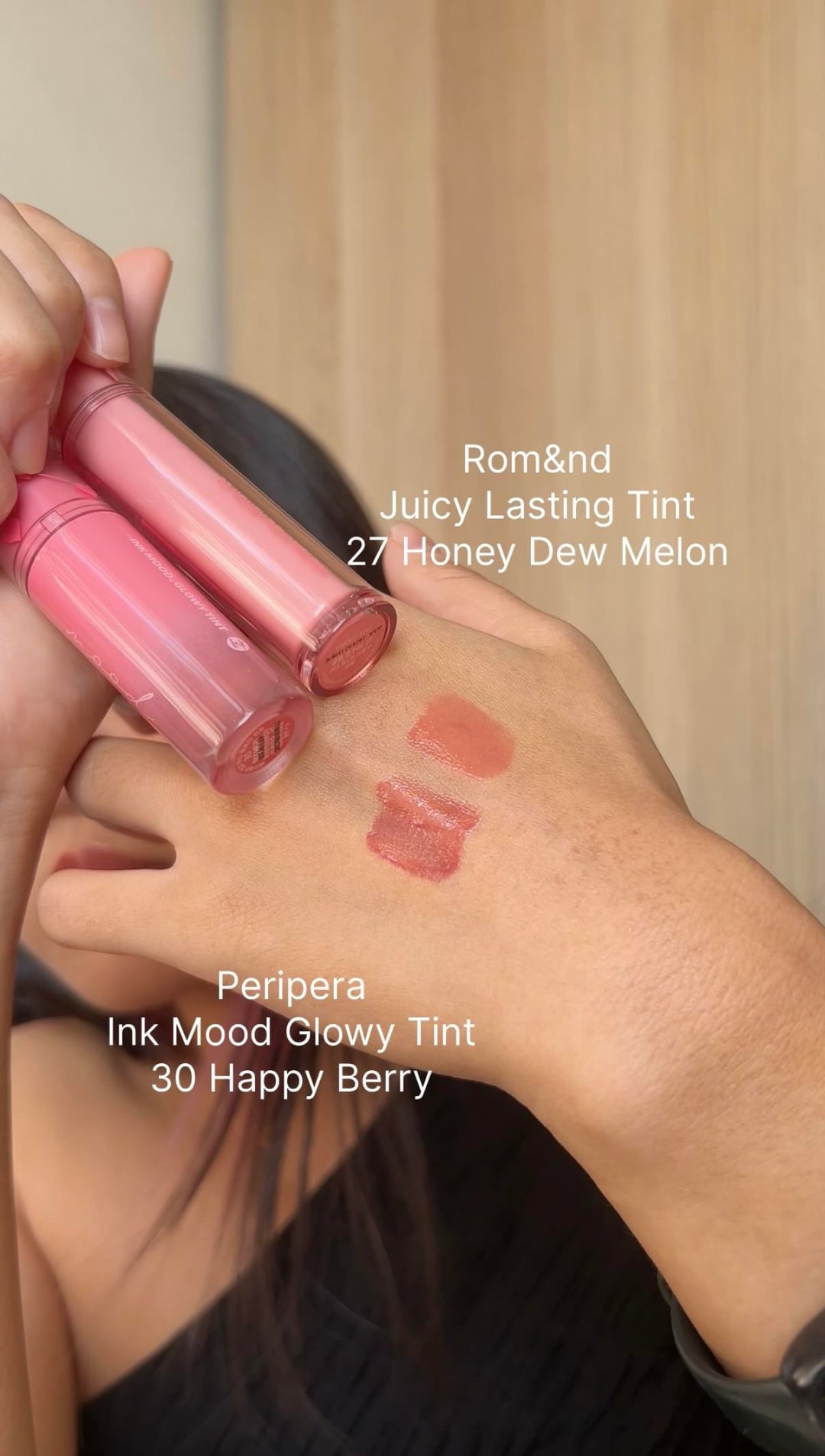Hey y’all, today I compared Rom&nd Juicy Lasting Tint 27 Honey Dew Melon and Peripera Ink Mood Glowy Tint 30 Happy Berry