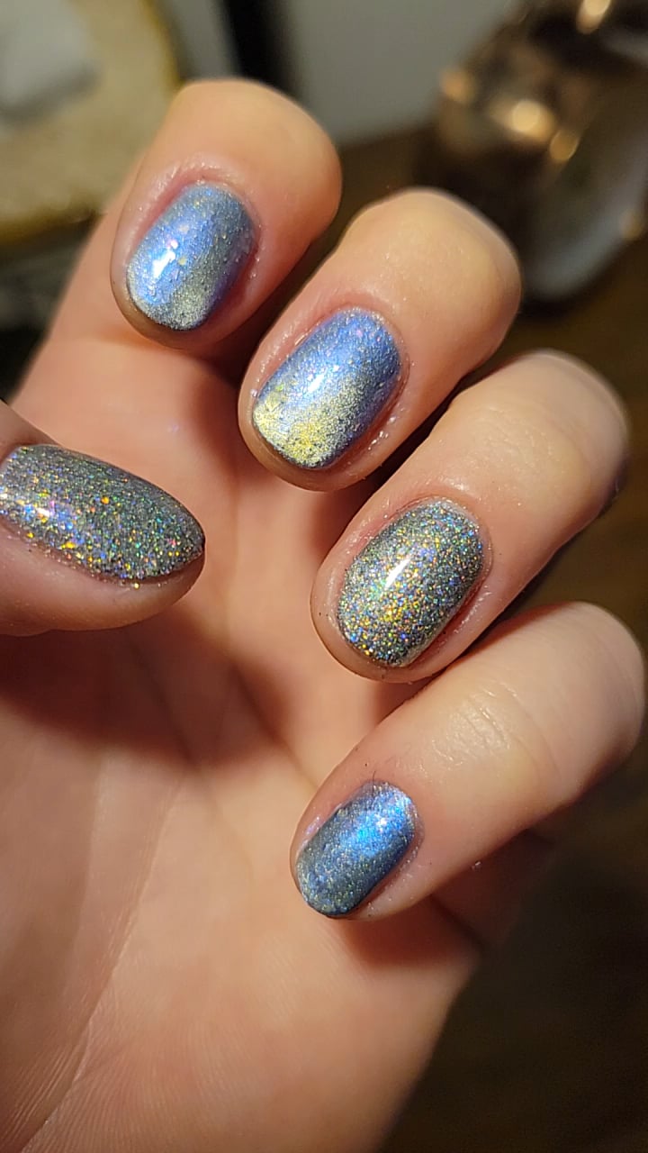 I wasn't sure if the magnetic toppers over the glitter accents would show up, but I wanted to give it a try! The gold magnetic topper on the right accent kind of got lost, but the silver holo magnetic showed up!