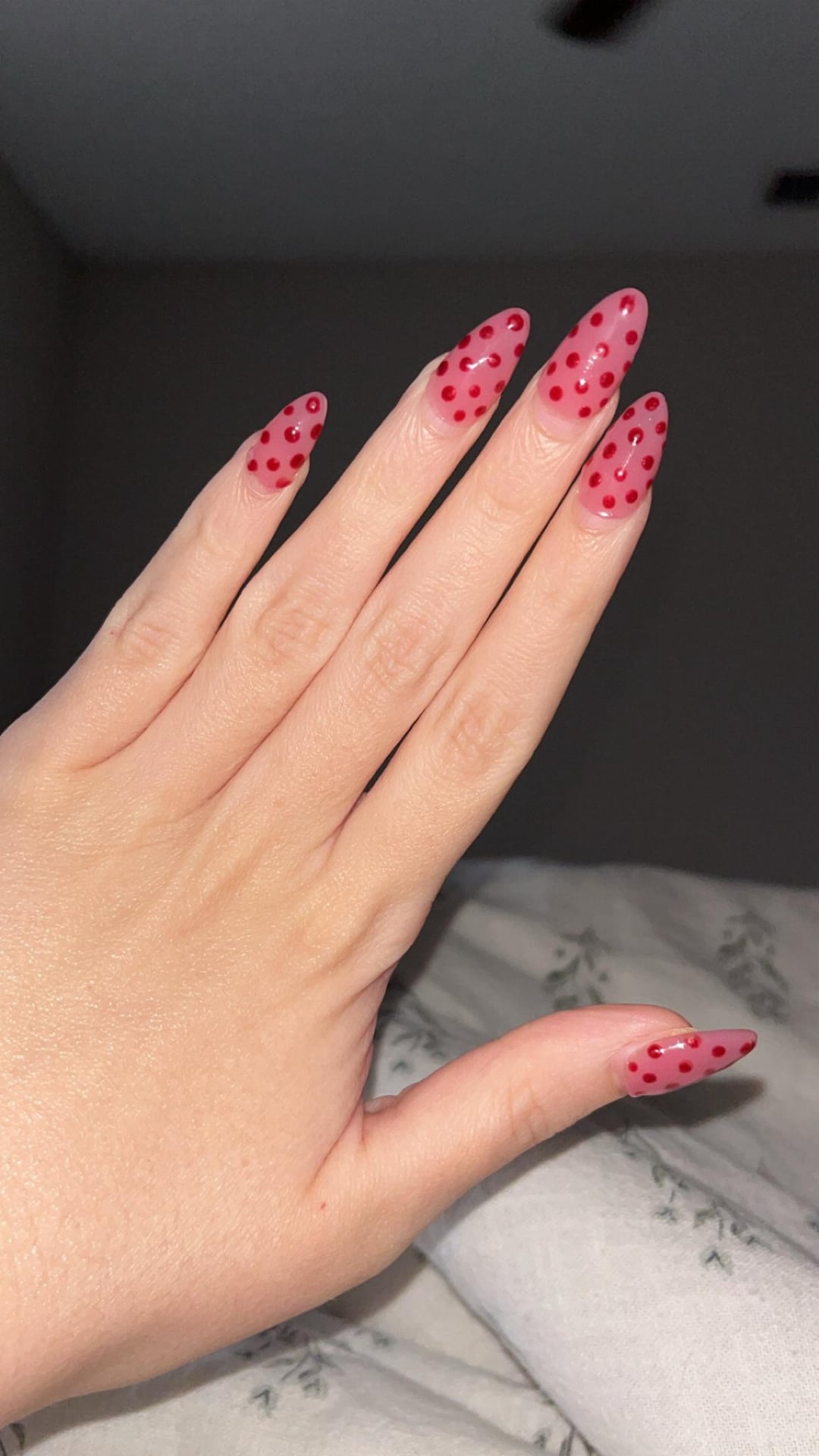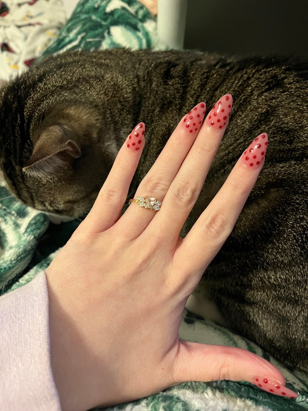 first pic featuring my cat bc he loves to be in my nail pics 🙂↕️ but these have been on for a month now! I’ve been super into a polka dot moment, my last set was basically these but in green lmao by Budget_Plum_2906