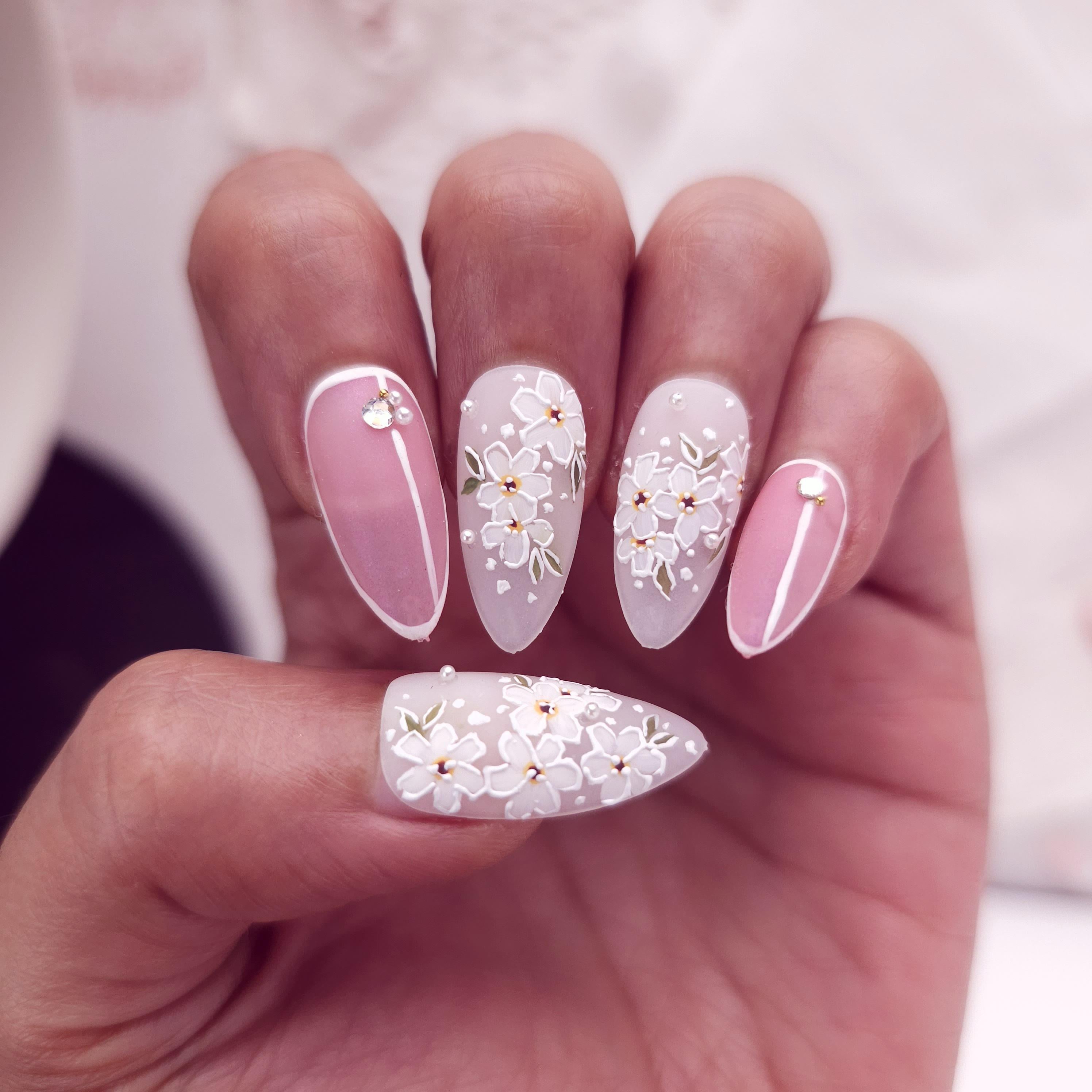 I wanted the flowers to look like delicate nail stickers without actually using decals, so everything here is hand painted and layered slowly with gel for that slightly raised effect 🌸