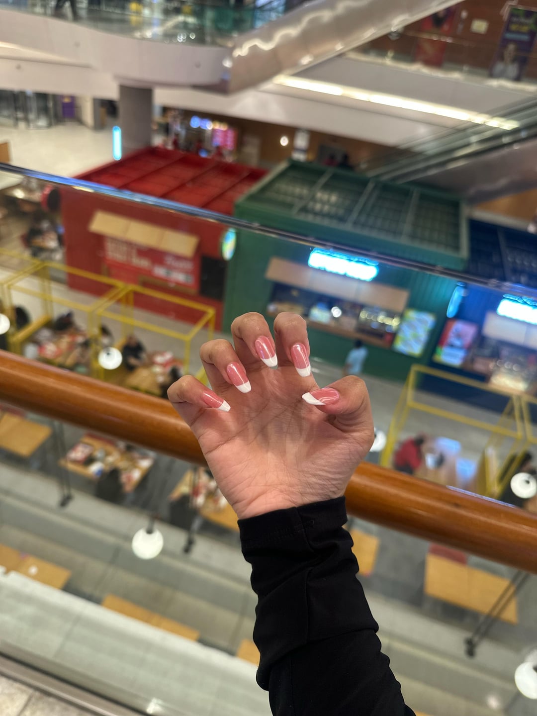 The pink by itself is actually beautiful with your skin. I think the French tip is throwing it off but altogether like that it does not look good. It looks weird. But your hands are gorgeous!