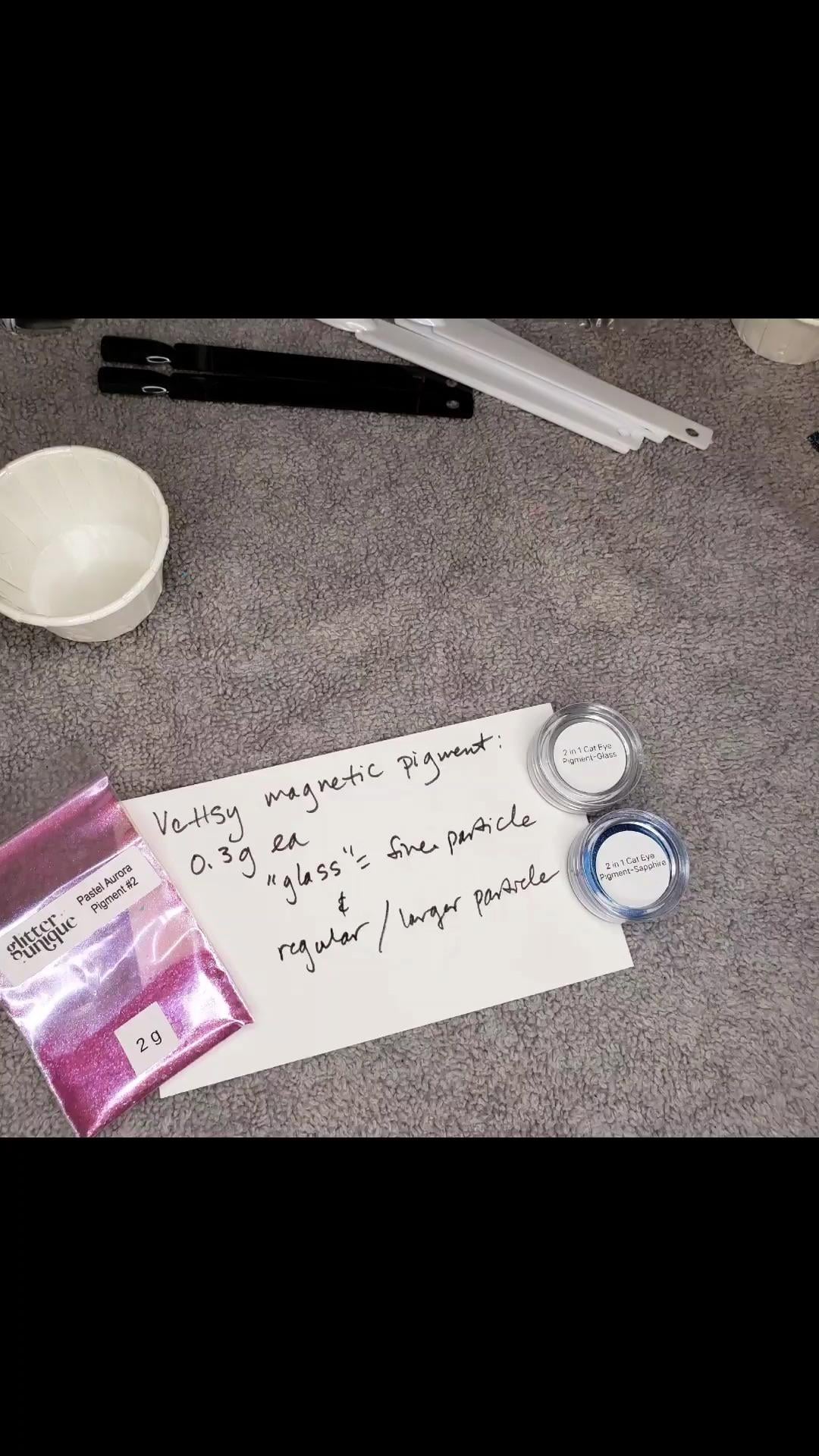 I included a picture of the TINY jar next to a small baggie of pigment from glitter unique just to show the amount. I'm so bad at translating number amounts to what that looks like in real life. Most of my GU pigments are 2g or "1 teaspoon" and I've never run out of any. The vettsy jars are 0.3g so they are definitely small. Halfway through the video i show the jar tilted plus the amount in putting in the "chaos" polish – i would estimate i could make maybe 3-4 polishes from that jar. ? It depends on your base color and how much powder you need to get a good magnetic effect on a darker or lighter color. I did find i needed more of the regular/ sparkly kind vs the very fine silver "glass" pigment went much further (in fact I probably added too much to the gold polish).