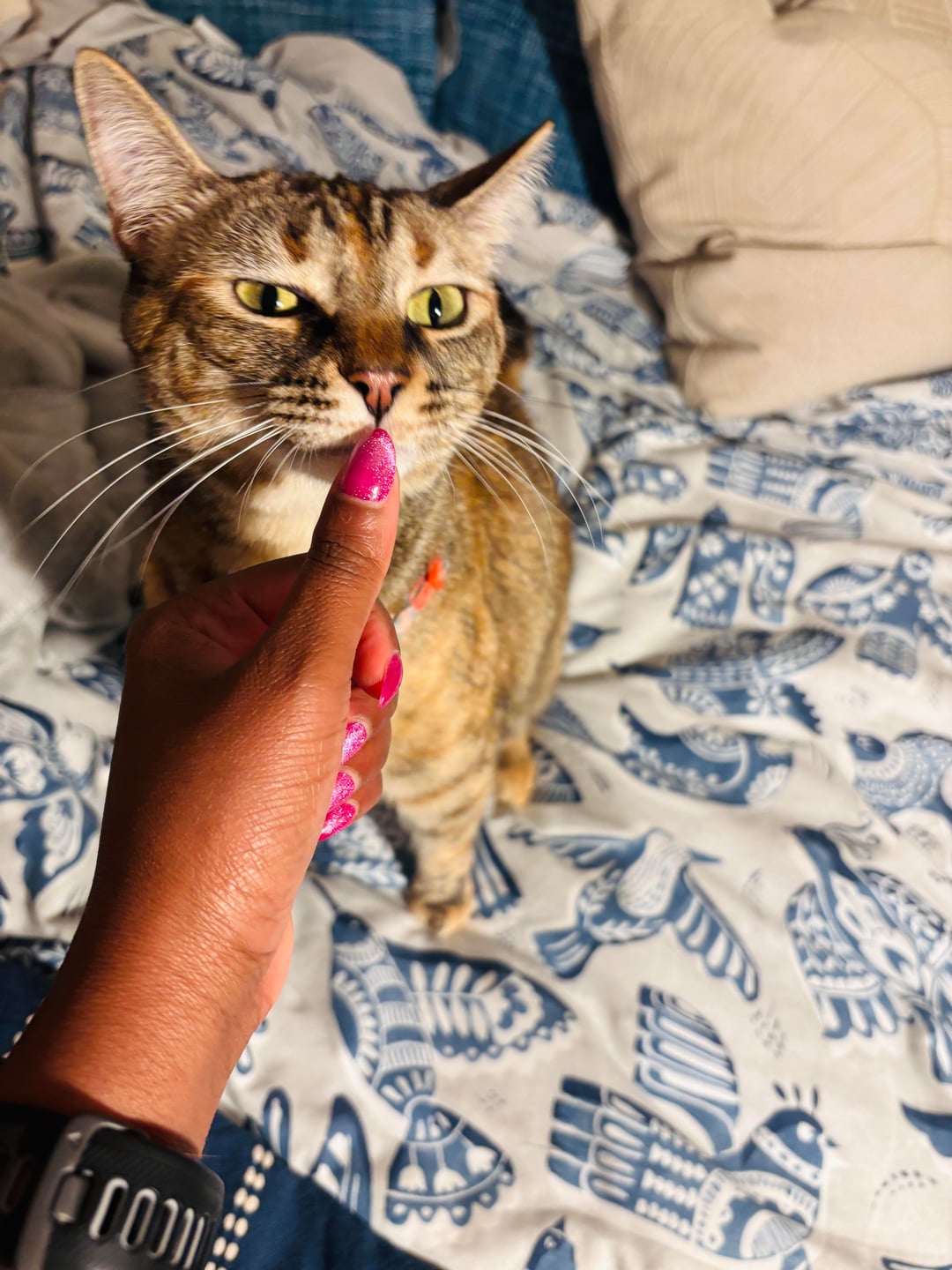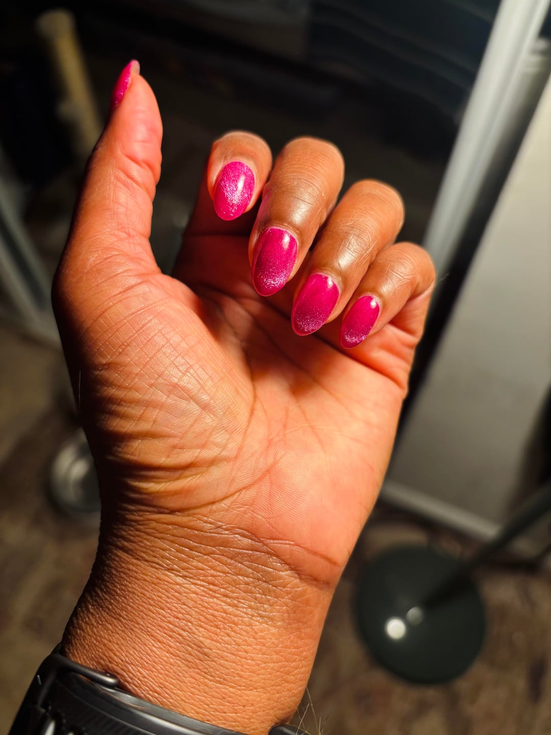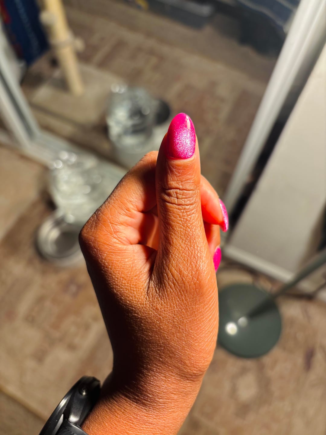 I think this shape and length looks good on you! I’m wondering what polish that is it’s crazy how different that thumb looks in the shade you wouldn’t think it’d be that hot pink in the sun😻