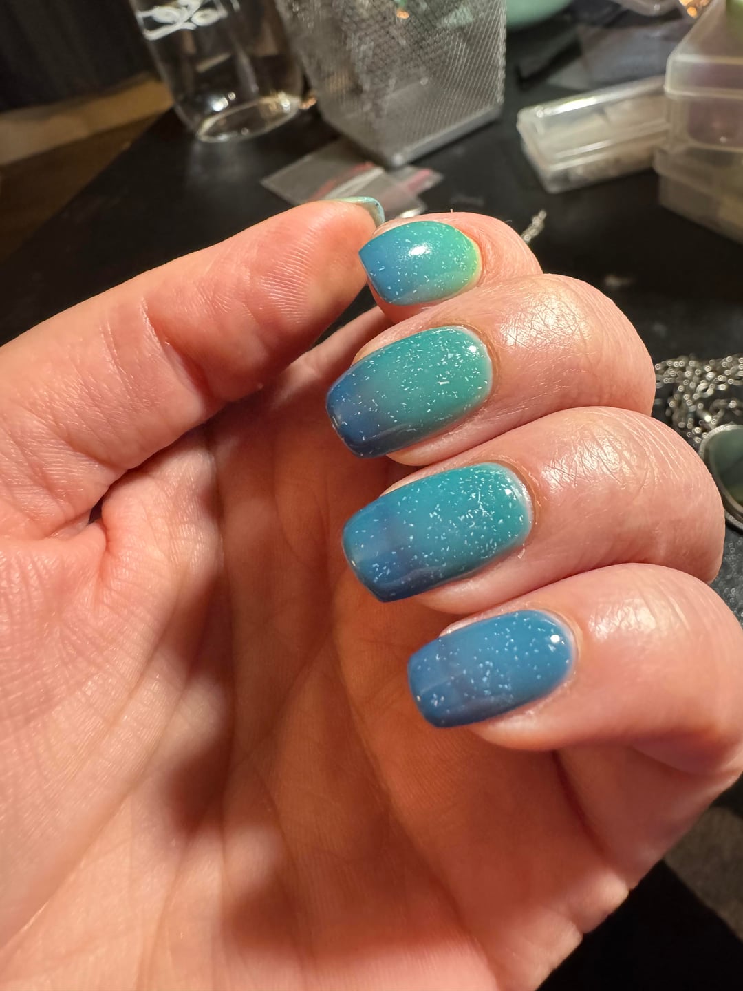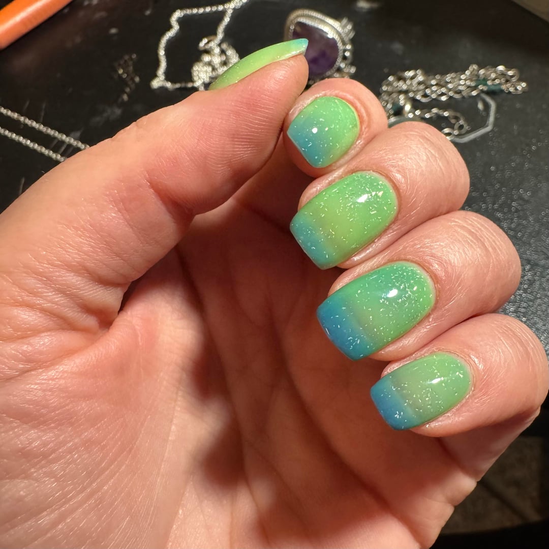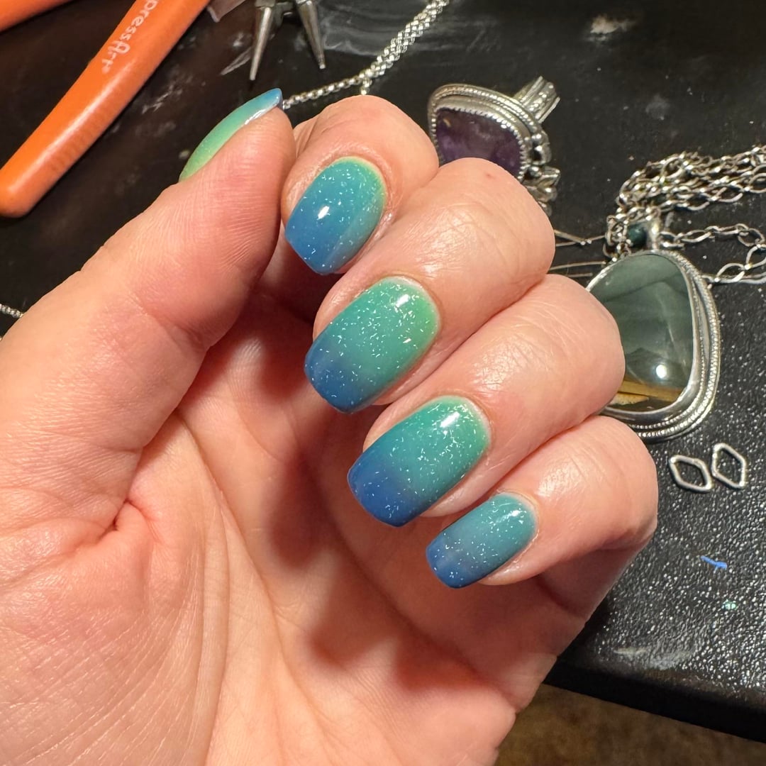 Attempting to assemble some jewelry I made over the weekend, but I am too distracted because the temperature in this room is terribly inconsistent and my thermal polish is VERY reactive. Really enjoying the color change in this one.