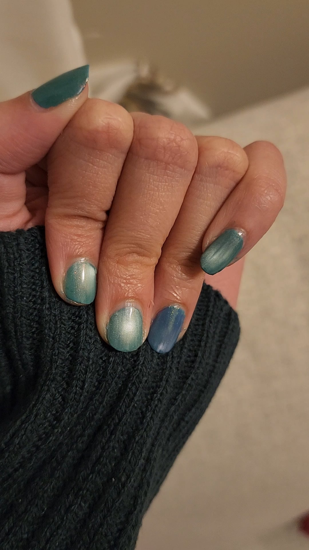 This is two coats of Anlac Haru over one coat of Colorbar Castle Green (a drugstore green creme) and KBShimmer's hydrating base coat. Both Haru coats were magnetized with the 5d spinner from Etsy. Ring finger has Anlac Aki instead of Haru.
