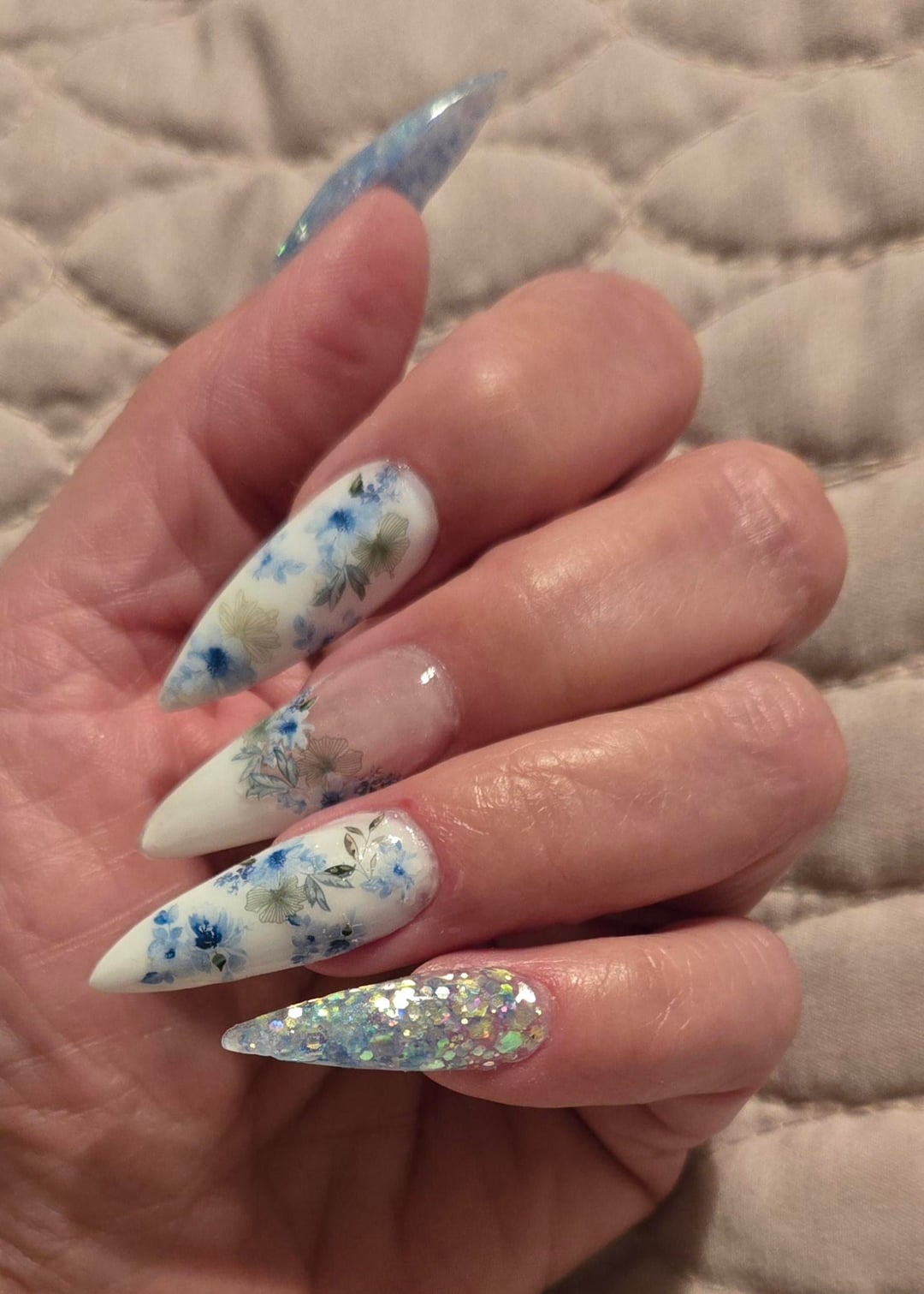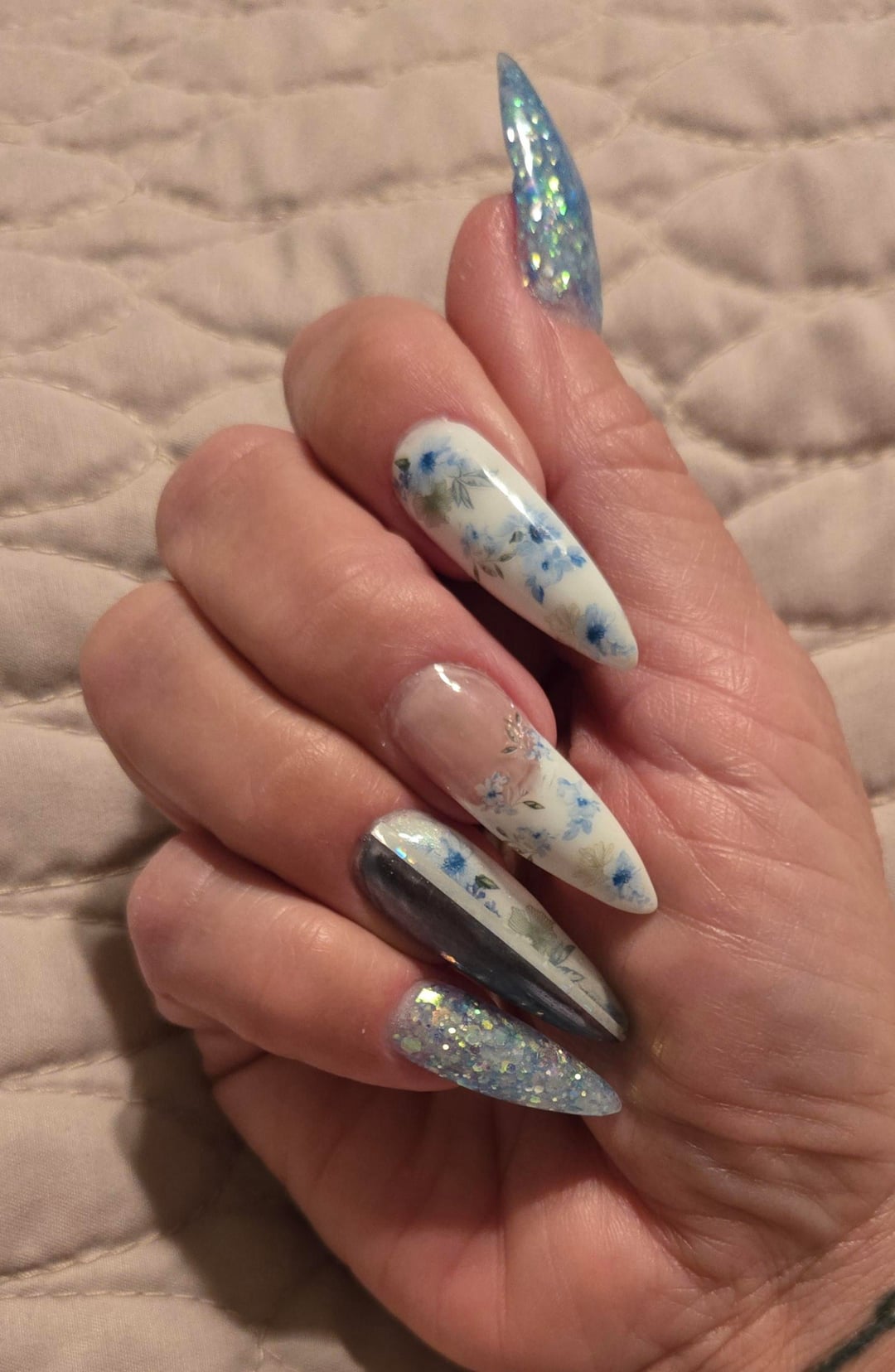 It was past Valentine's Day, but I still wanted flowers. I was getting ready to visit colder weather so I wanted a slightly more "wintery vibe". Blue roses and icy blue glitter felt like a good choice! I sculpted with polygel, added glitter to clear, and added stickers. 🙂 What do you think?