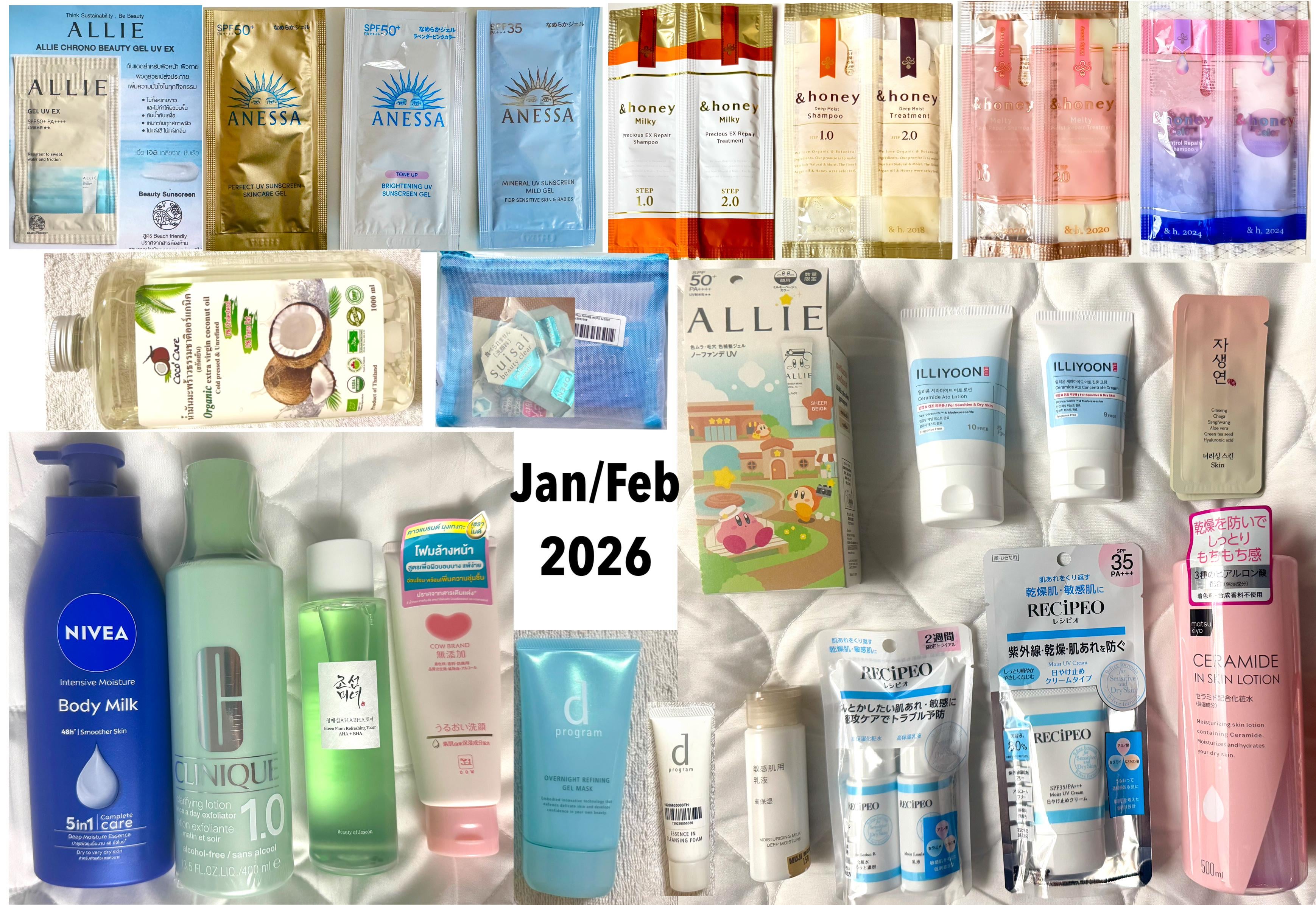 ALLIE UV Gel EX, Anessa Gel (gold), Anessa Tone Up Gel, Anessa Mild Gel (powder blue), &honey shampoos and conditioners (milky, deep moist, melty, color)