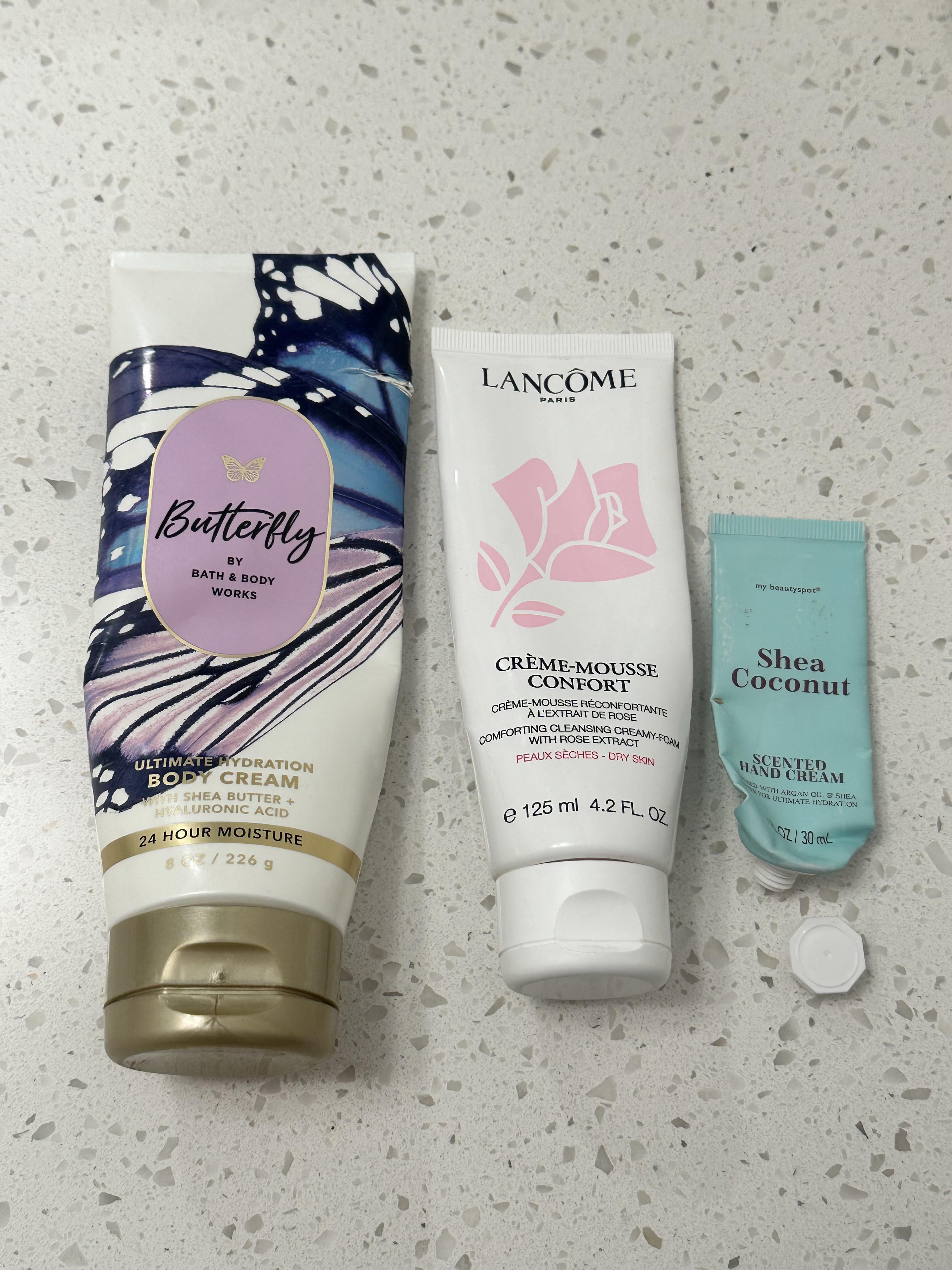 uhh if you count lotion, hand cream, and cleansers Left to right, BBW Butterfly body cream; Lancome facial cleanser (dont recommend); and my beautyspot Shea Coconut hand cream by CommentEmergency3375