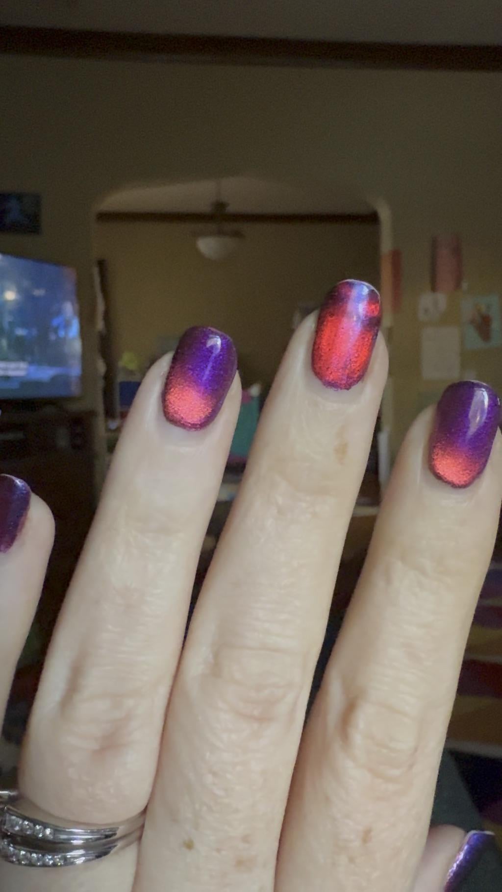 I posted last week when I first put the EdM shade on and there was interest in seeing it next to other similar shades. The only similar color I have is the SS shade. Here it is on my index finger and my ring finger. The rest is EdM. EdM magnetic pigment is definitely more magenta and stronger, the EdM base is more blue whereas the SS base is more purple.