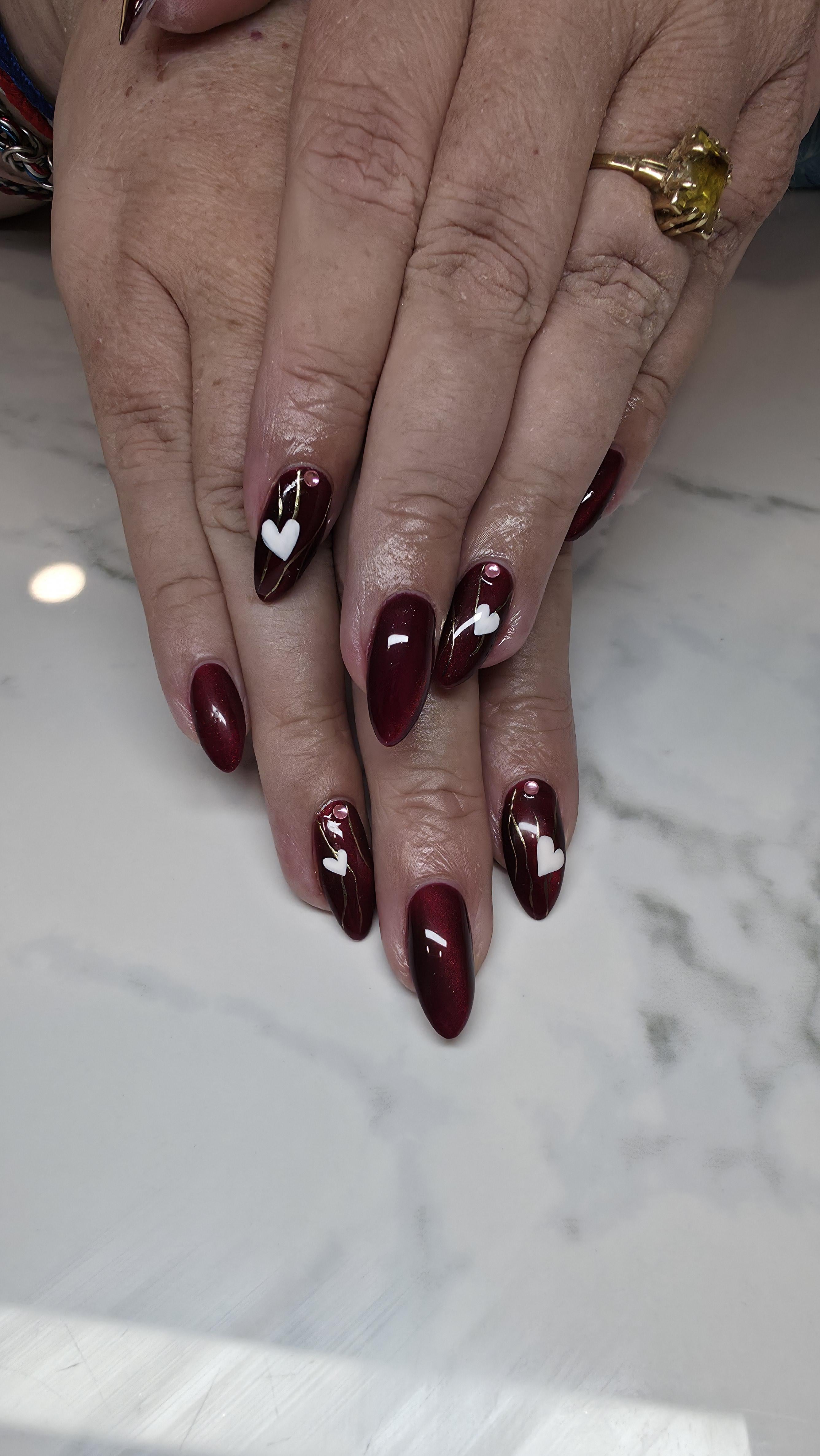 If you look closely the "plain" nails have the cat eye effect and the ones with the hearts have golden veins. by MamaH831