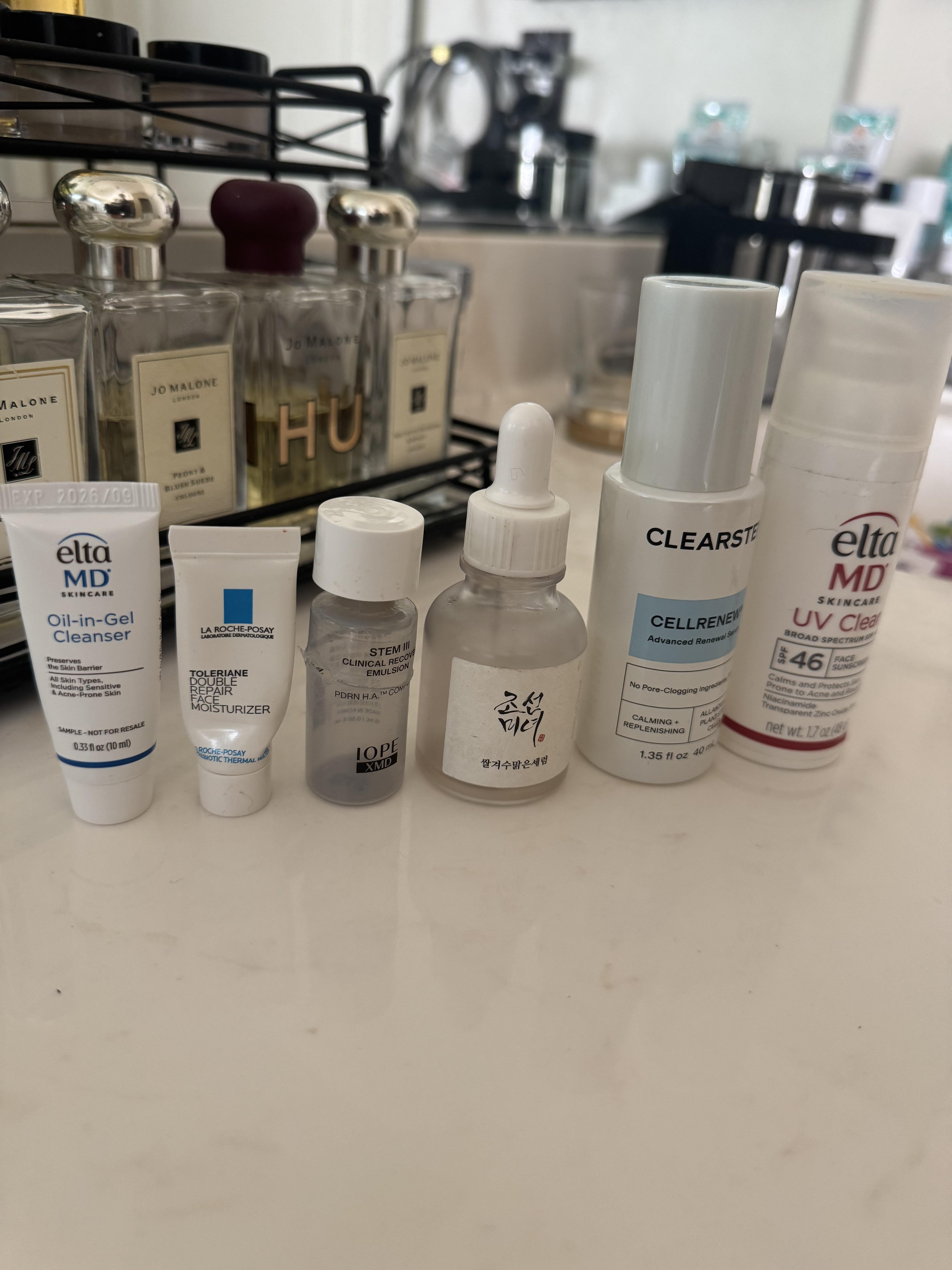 EltaMD oil in gel cleanser LRP toleraine double repair face moisturizer IOPE stem iii clinical recovery emulsion Beauty of Joseon glow deep serum Clearstem cell renew Elta MD UV clear SPF 46 sunscreen by Blackberry2044