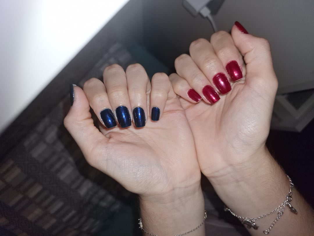 in the red hand I used 2 layers of carmin – risqué and 1 layer of amante perolado – impala