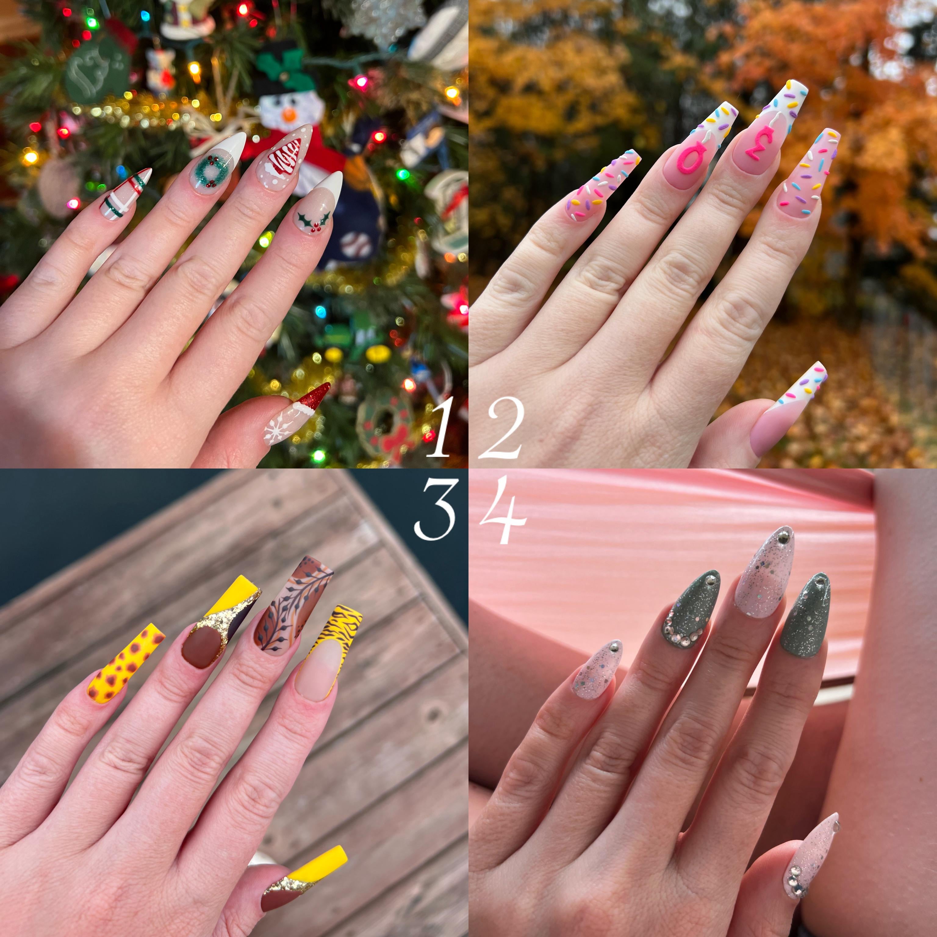 I usually only do long coffin because I personally thought this shape best suited me, sometimes I’ll throw in a square here or there (long or medium) but I’ve always thought they look kinda weird on me which sucks bc I do love the shape and am jealous of the ones who can pull them off, I’ve only ever done that one photoed set of the almond shape bc I didn’t really like how they looked on me but they seem to be the consensus but the ones I have the thumbs are too small for me now bc my thumb nail bed is wider than it was when I did these back in I think 2024, & I only just started to try out the pointed “stiletto” (I know not true stiletto more like an almond stiletto shape) making 2 sets this shape bc I didn’t know how they’d really look on me but kind of don’t mind them. I have such weird fingers I feel 😅 my pointer specifically because it like curves to the side, same with my pinky.