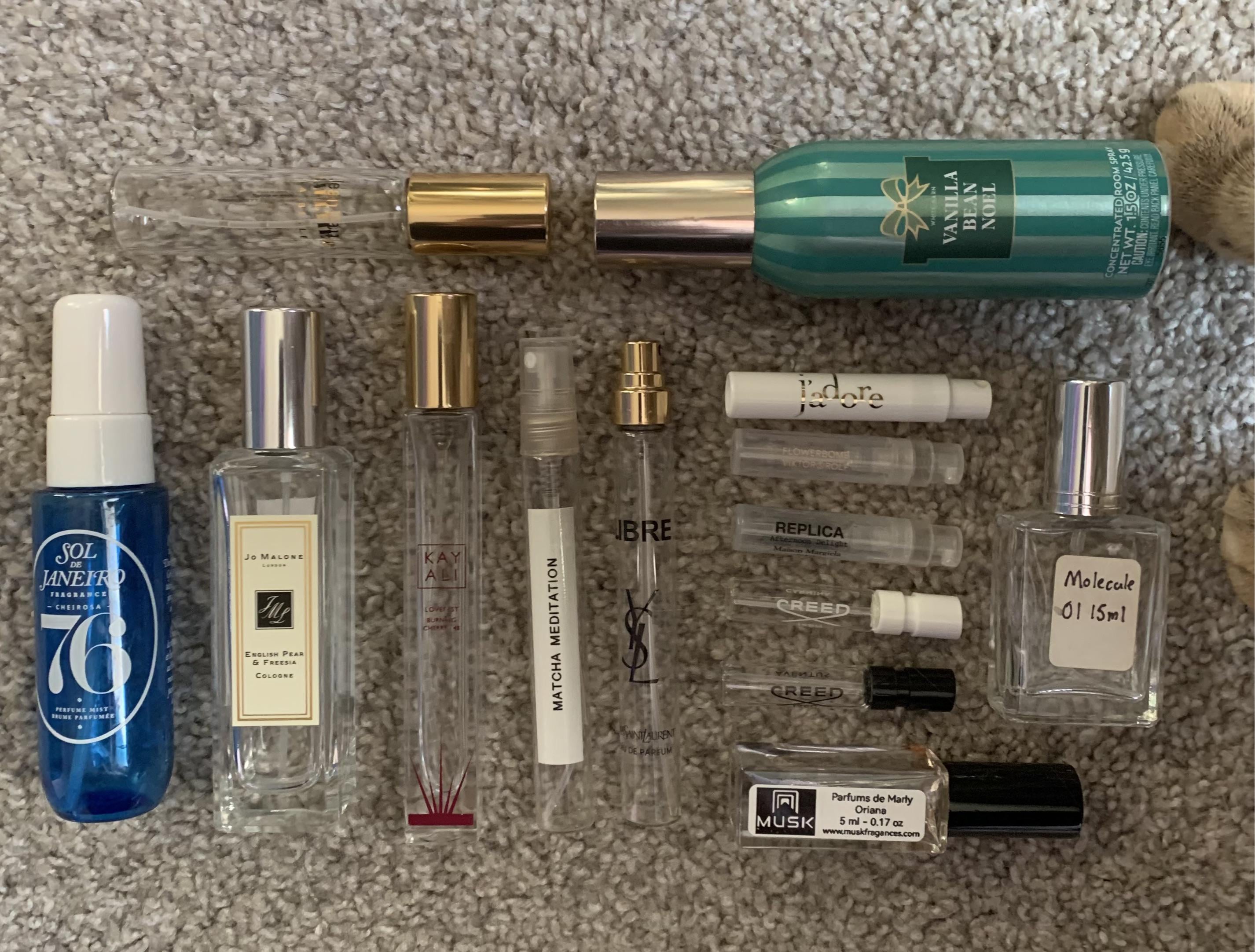 Products: Sol de Janeiro 76, Jo Malone English Pear and Freesia, Kayali Lovefest Burning Cherry, Replica Matcha Meditation, YSL Libre, JPG La Belle, BBW Vanilla Noel (Room Spray), Dior J’adore, V&R Flower Bomb,Replica Afternoon Delight, Creed Aventus (and I can’t read the other one now, sorry!), Parfums de Marly Oriana, Wccentric Molecules Molecule 01.