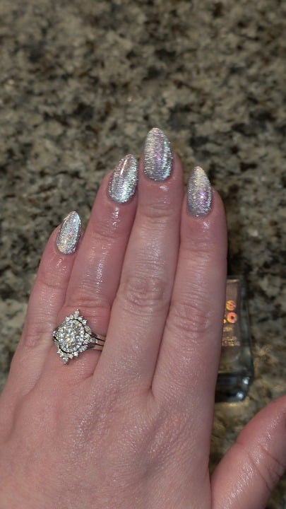 also, a moment of silence for my pinky nail please, i broke her in half this past thursday bringing in groceries, so i cut them all down to the length you see here. another huge win for this polish line is, after i broke the pinky, i was able to file and shape her with last weeks manicure still on *as if it was gel*!!! i was able to clip the tips of all the other nails with the nail clippers, and then file and shape them, all with the polish still on!!!!!! polish did not chip off and i was able to get 3 more days of the manicure before changing them to this shade today, which you see here in the post. i just put an easy quick dry top coat on top so i could re-cap the nails. this is quite unheard of for me, usually if i try this, little chips happen and i either have to redo the whole manicure or at the very least touch up spots.