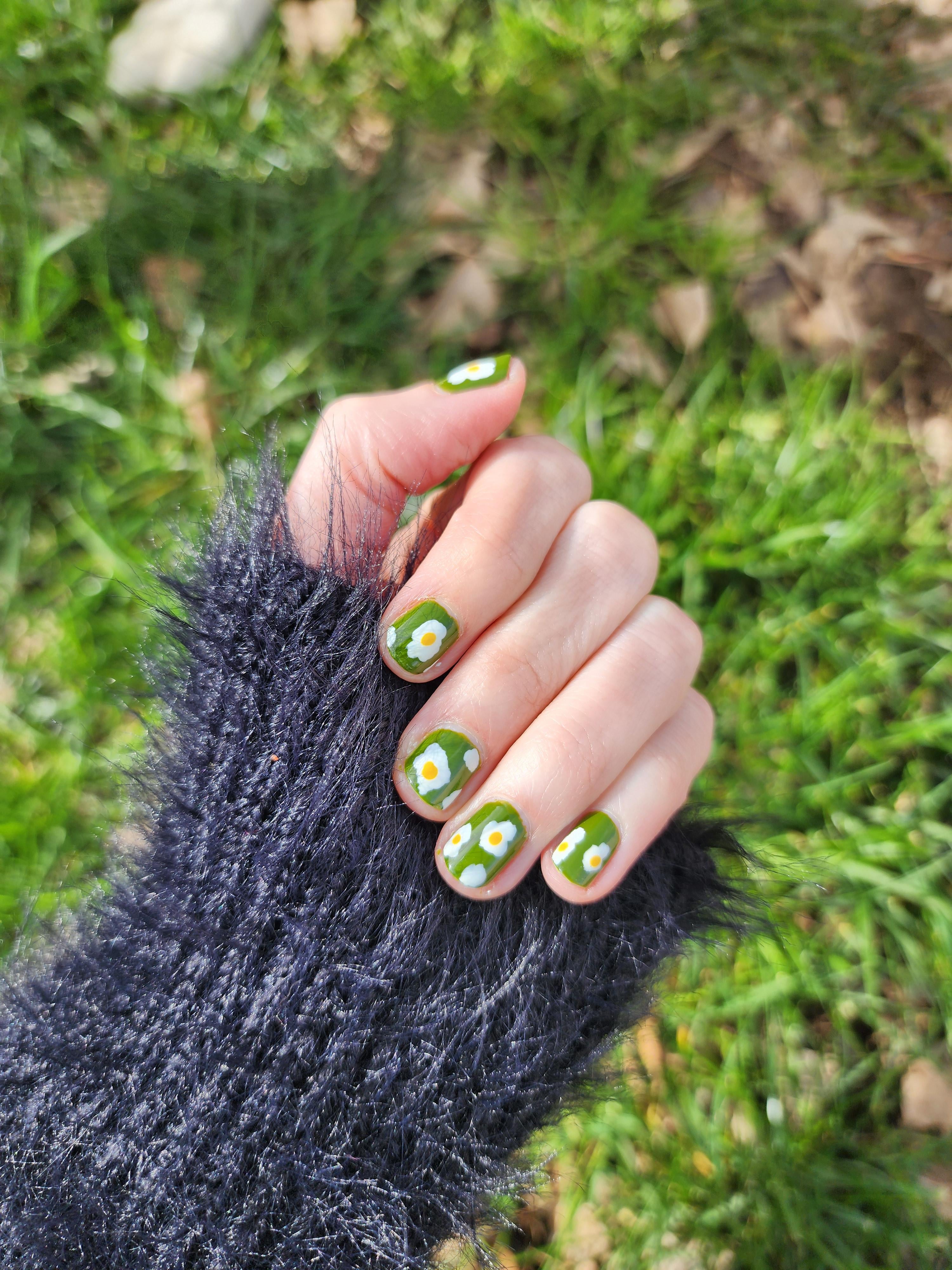 Colors used: Cracked – Sunlit Moss (green). Cracked – Jokes On You (white). Cirque Colors – Mango Jelly (the yolk!). First time I've tried anything other than polka dots and hearts. by her_cupcakes