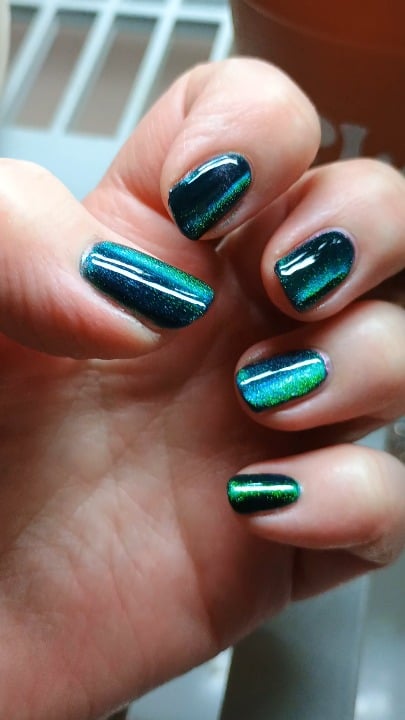 I put it on a swatch stick and before I even magnetized it, I thought maybe I'll just try it on one of my nails because I'm going to change my manicure later anyway. I tried the neodymium bar magnet straight up and down after seeing someone's post a day or two ago. OP had used that methodology with Bogdweller. It looked good on my nails and I kept going!