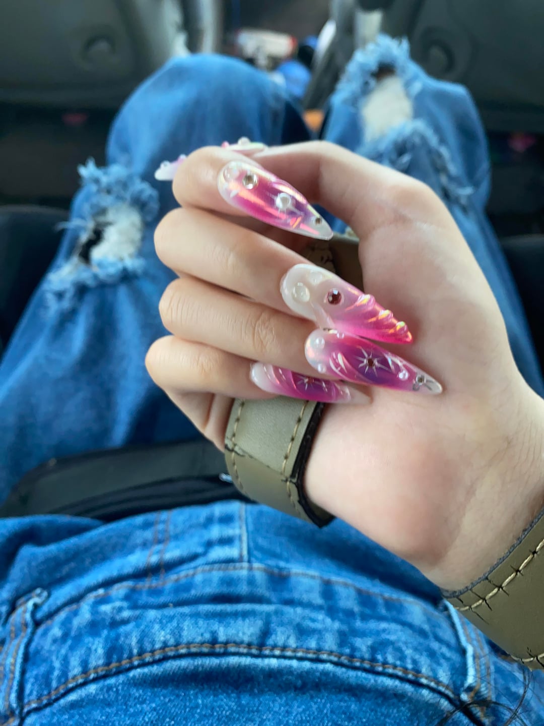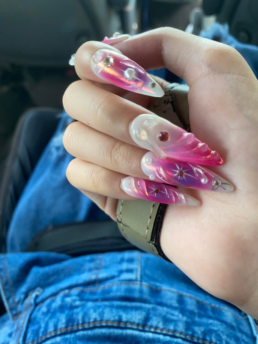 If these are Press-ons – I’d definitely try resizing on the next sets because these are too big/wide for your nail bed,,, however the art is gorgeous!