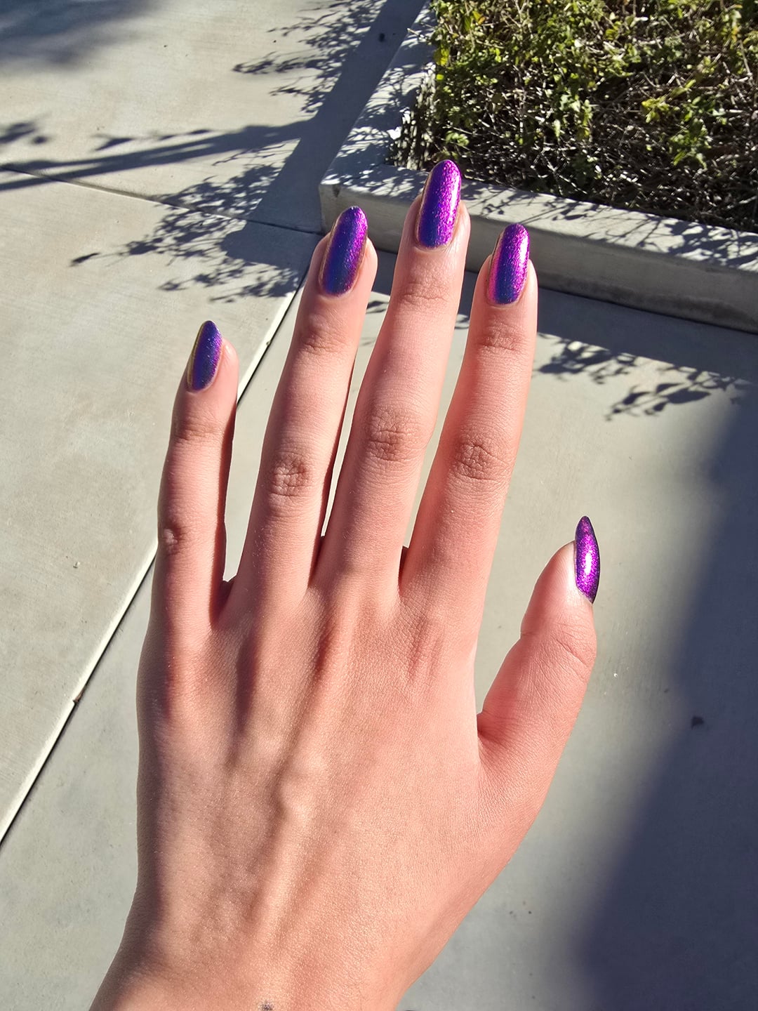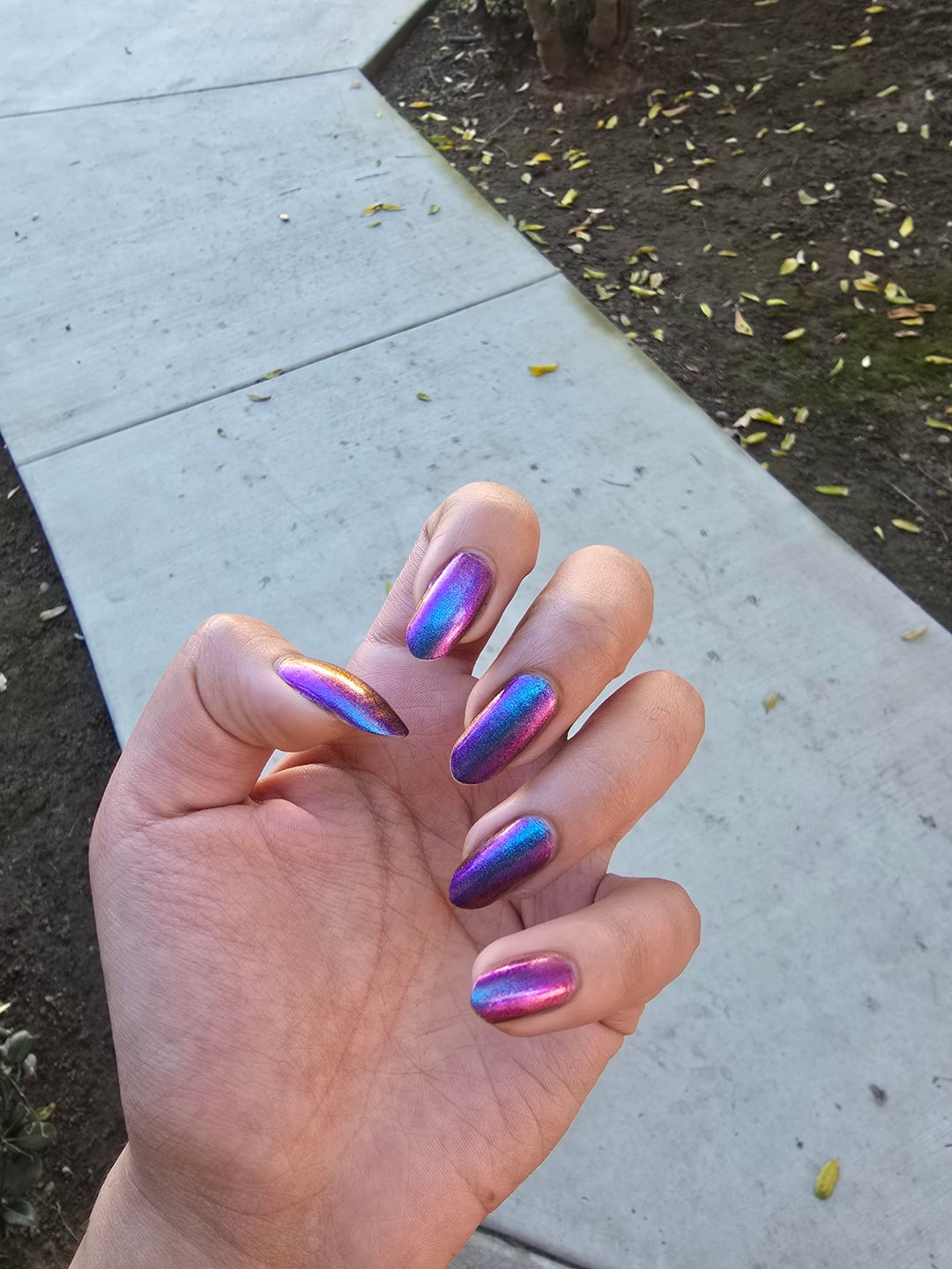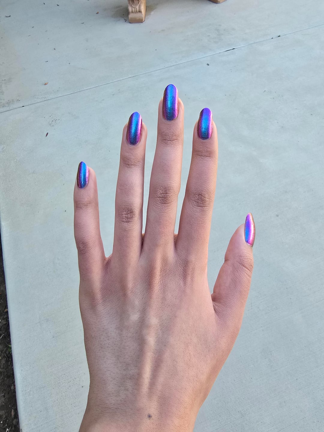 Felt purply this week!! Really love the chrome shift of this polish and how much it changes between blue & purple & pink!! It wassss a little thick though, which made it difficult to work with :/