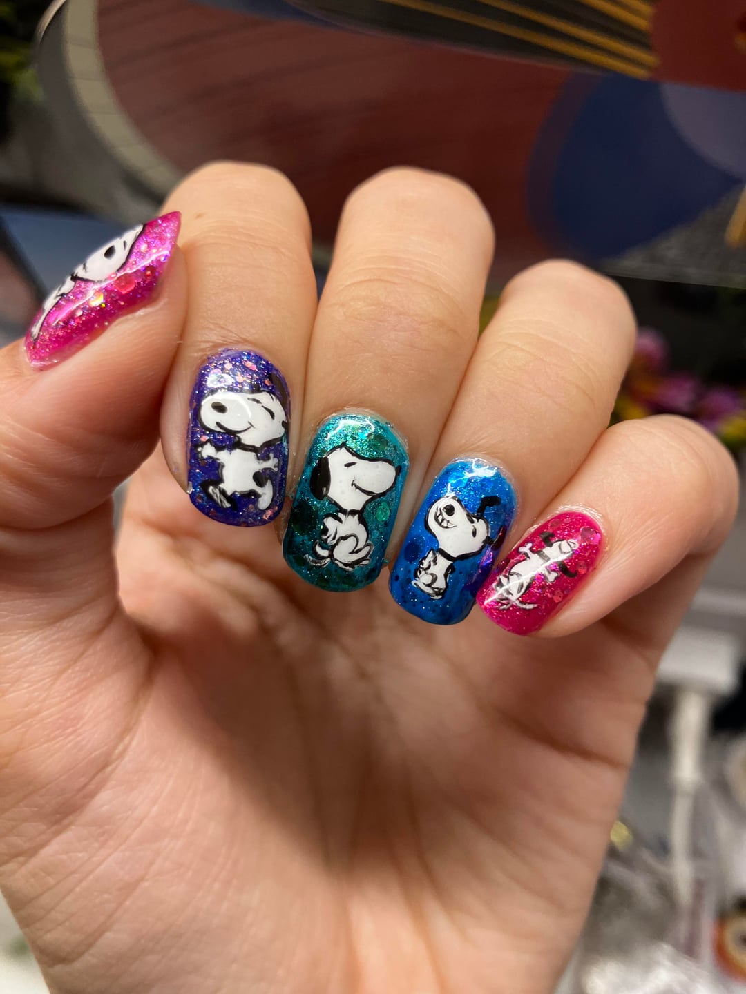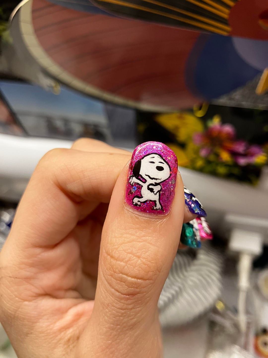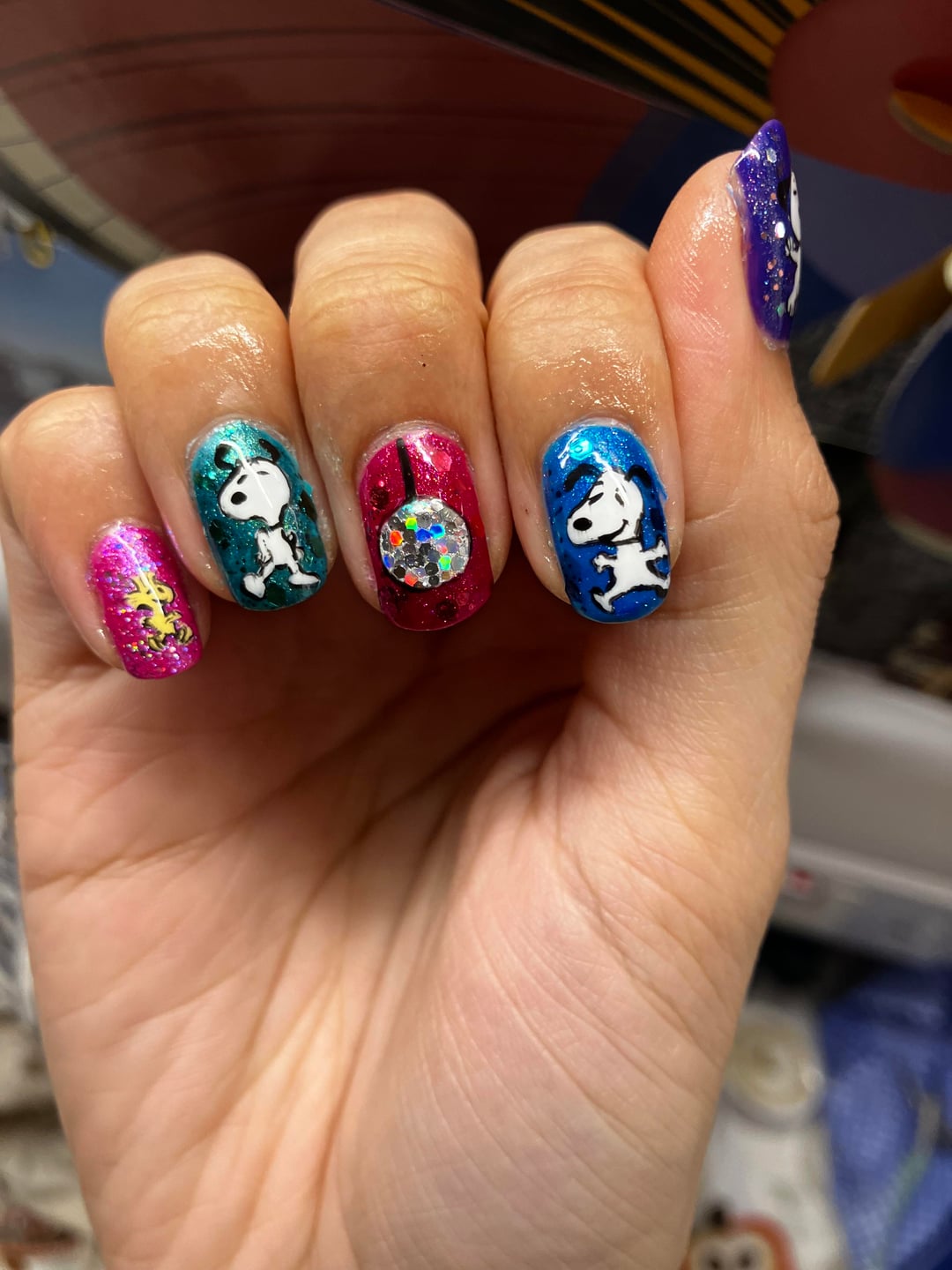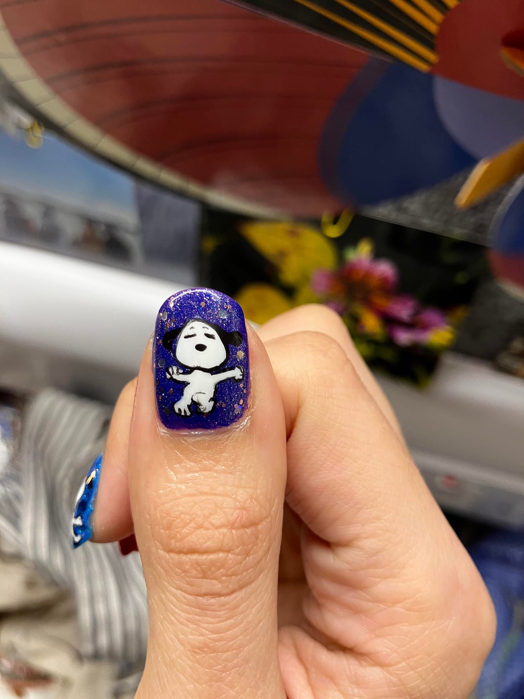 Thought I’d share my ‘disco all the time kiss occasionally’ nails with snoopy grooving to the new harry styles album.