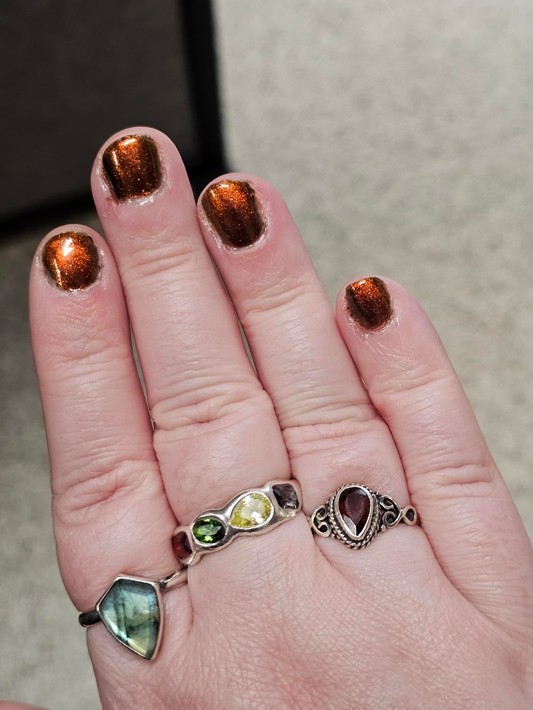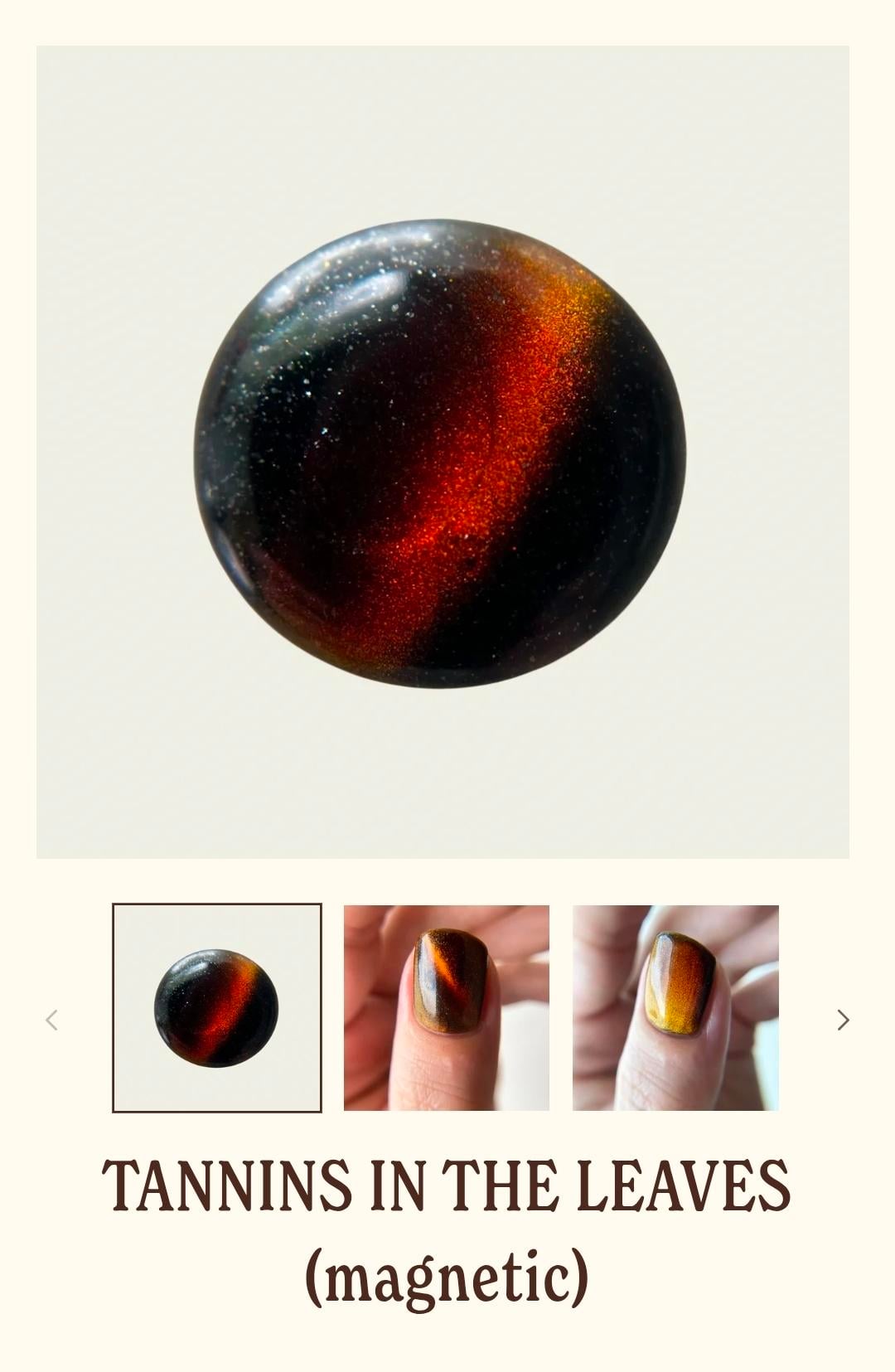 I ordered "Tannins In The Leaves" from Death Valley Nails because of the cat eye effect but after using three generic magnetic wands off Amazon, I'm stuck with this weird coppery shimmer effect instead of what's show on the website. I used three coats and tried magnetizing each one while still wet per their website's instructions.