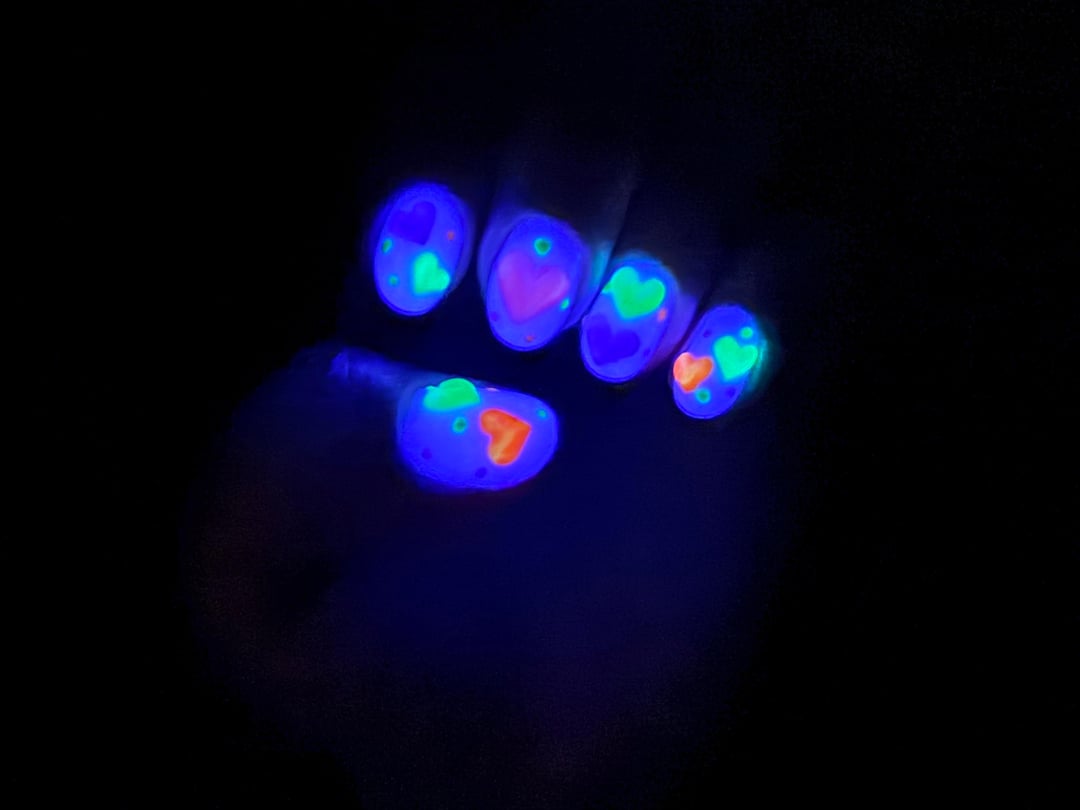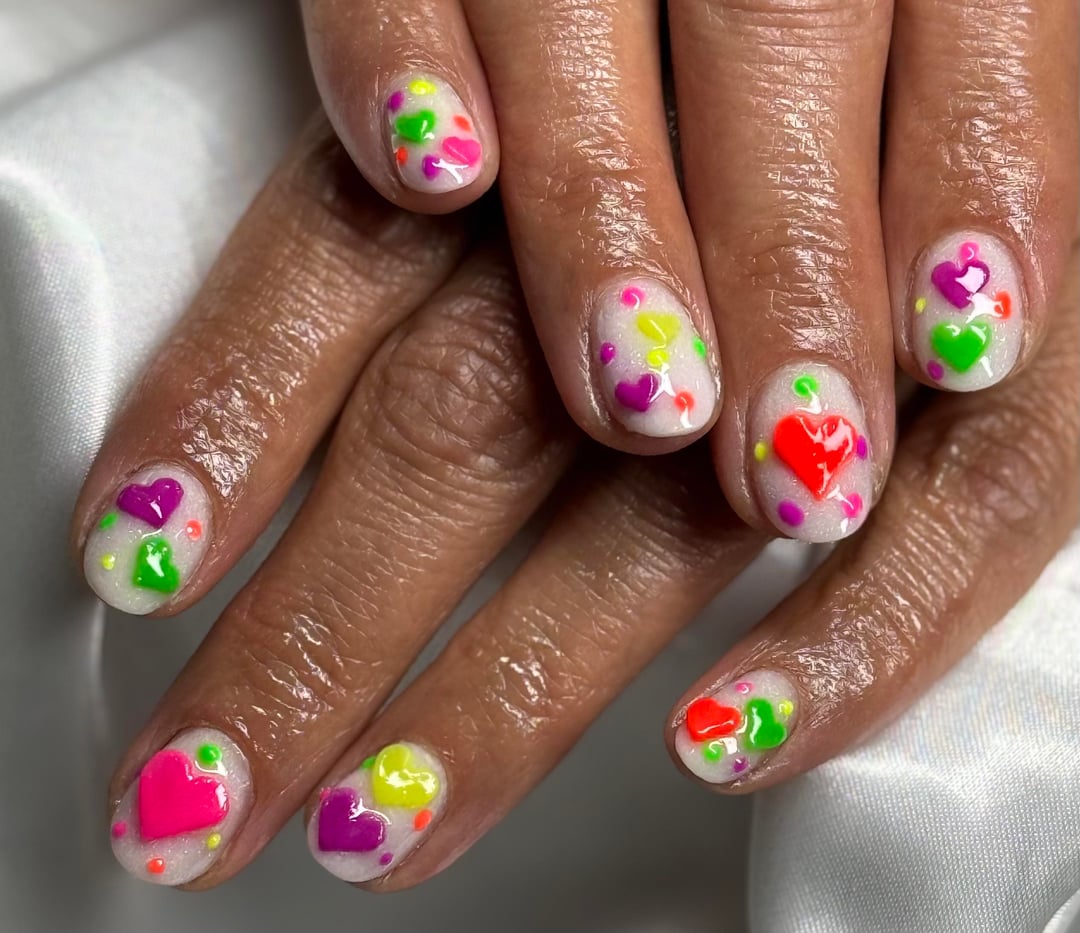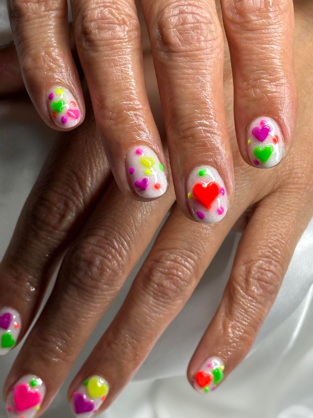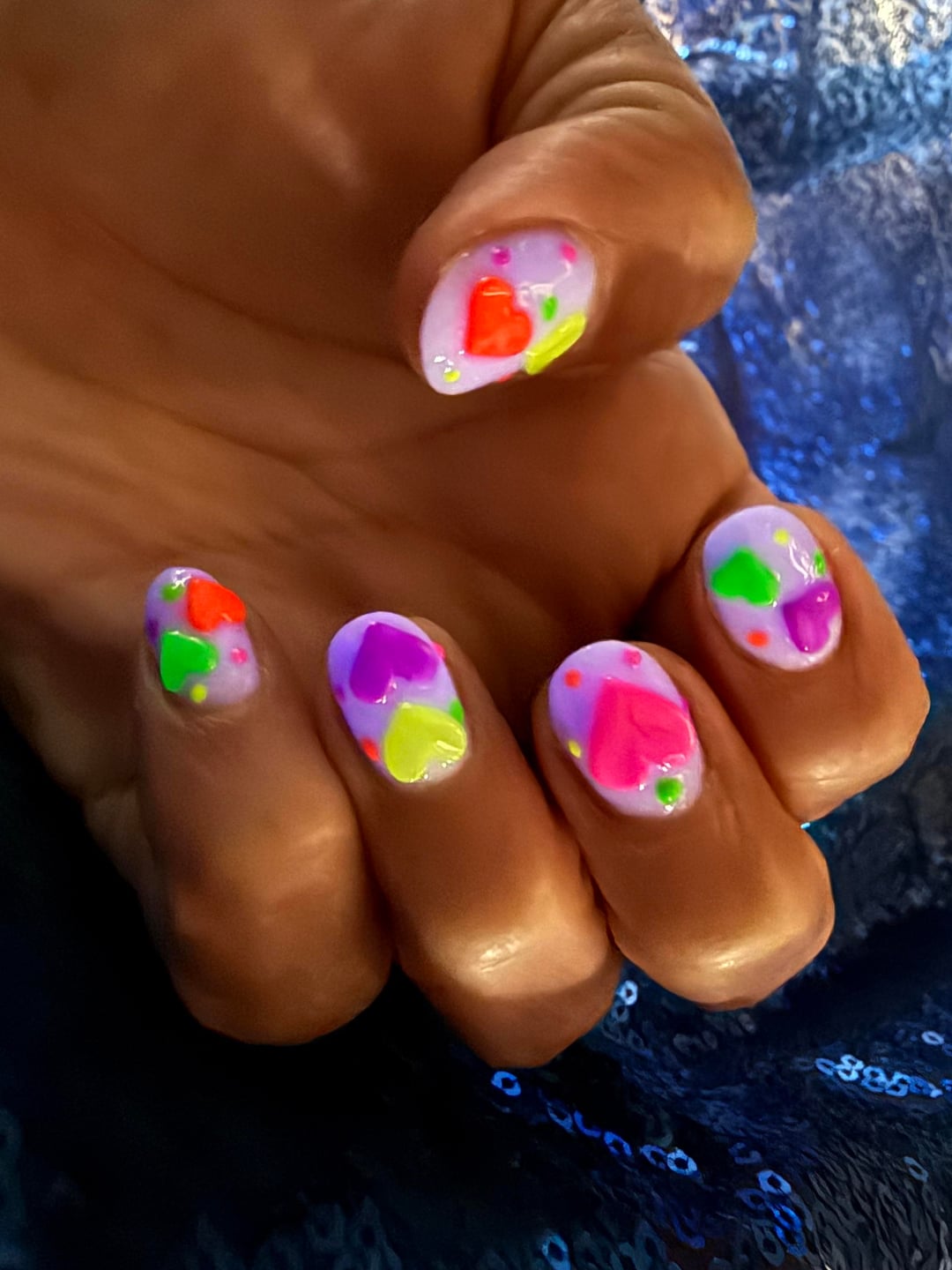 I asked for 3d acrylic hearts in multiple colors and I love them so much. My nail tech hadn’t done 3d before, so I went in knowing they may be a bit clunky, but she’s truly skilled so I had faith. The white base is also glittery, but it’s kinda hard to tell. Also, why is taking good photos of nails so difficult? 😅