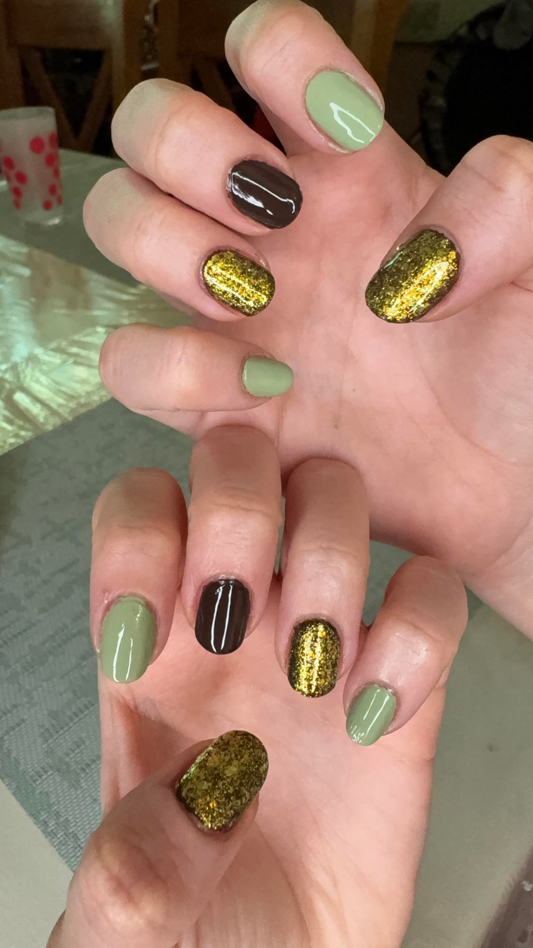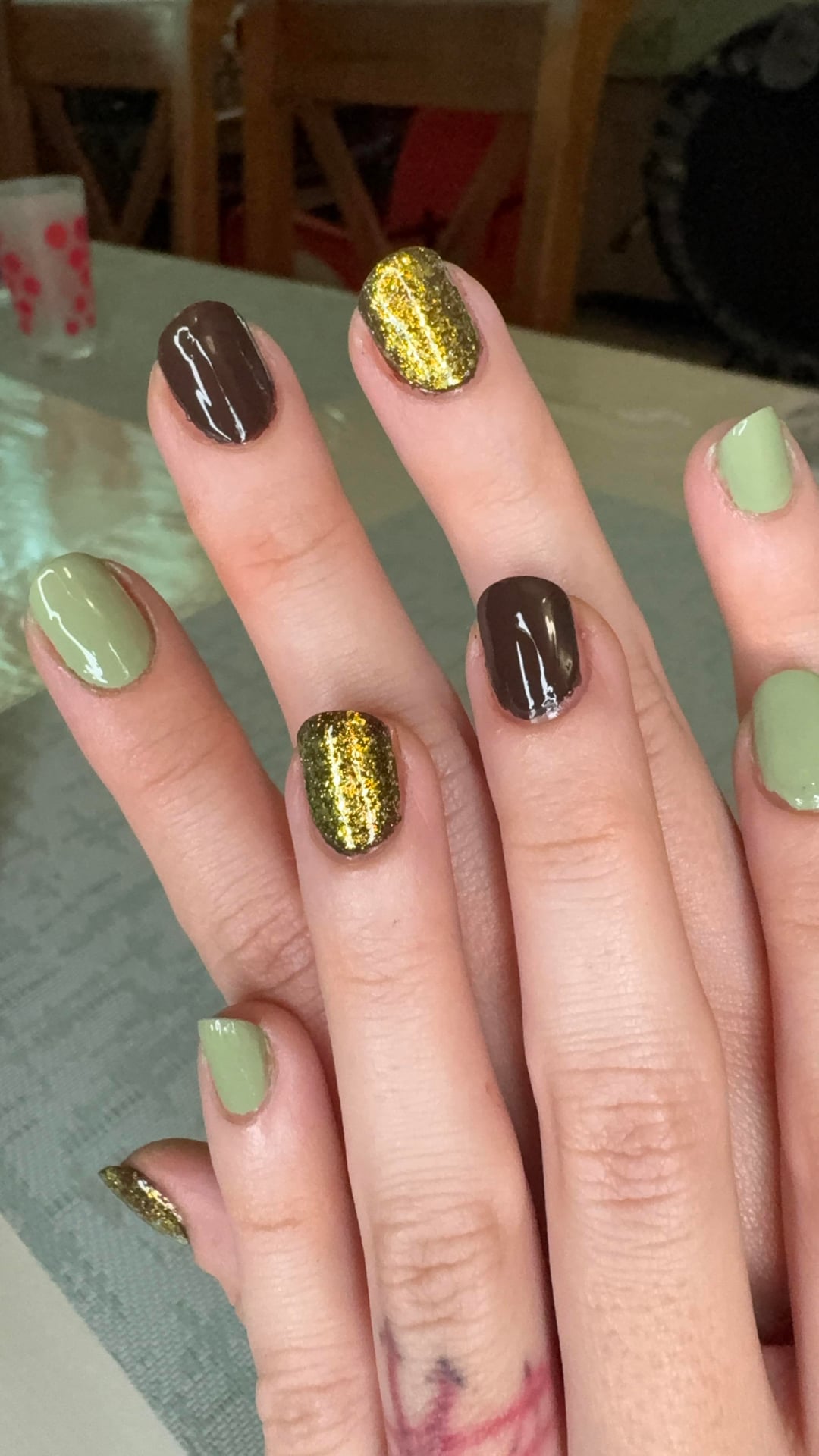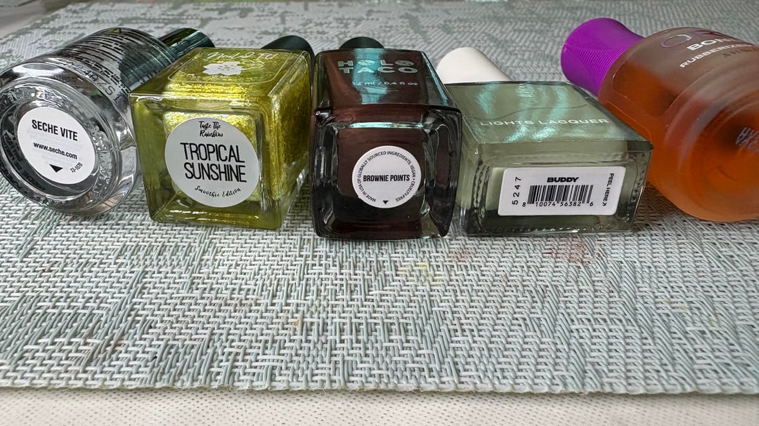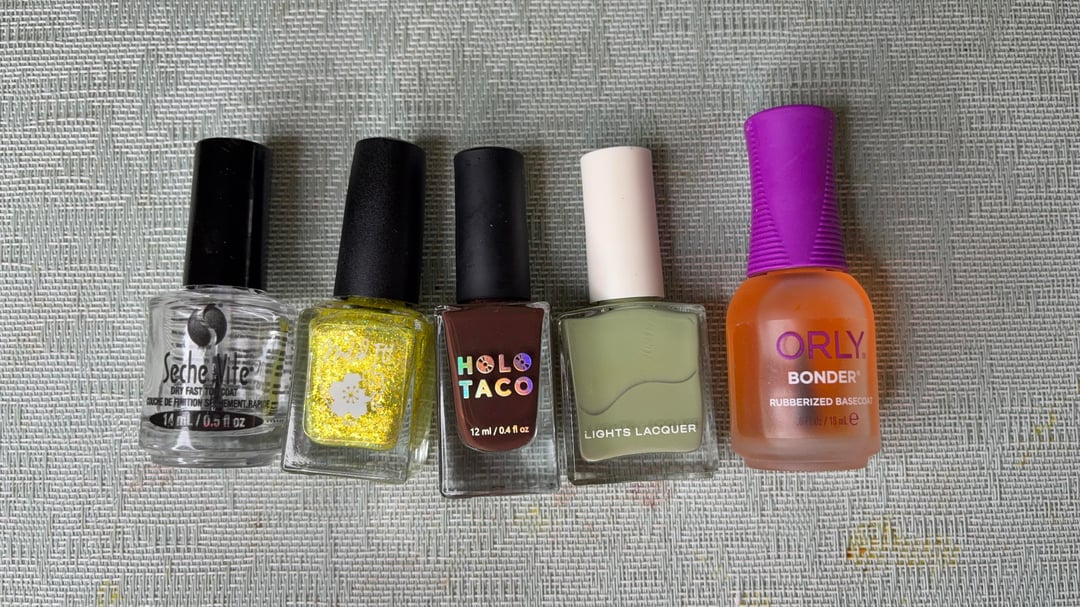 Burninguninterrupted on March 6, 2026 10:37 pm Polishes used: 1. Seche Vite – Dry Fast Top Coat 2. Tropical Sunshine – Nailed It! 3. Brownie Points – Holo Taco 4. Buddy – Lights Lacquer 5. Bonder – ORLY Rubberized Base Coat